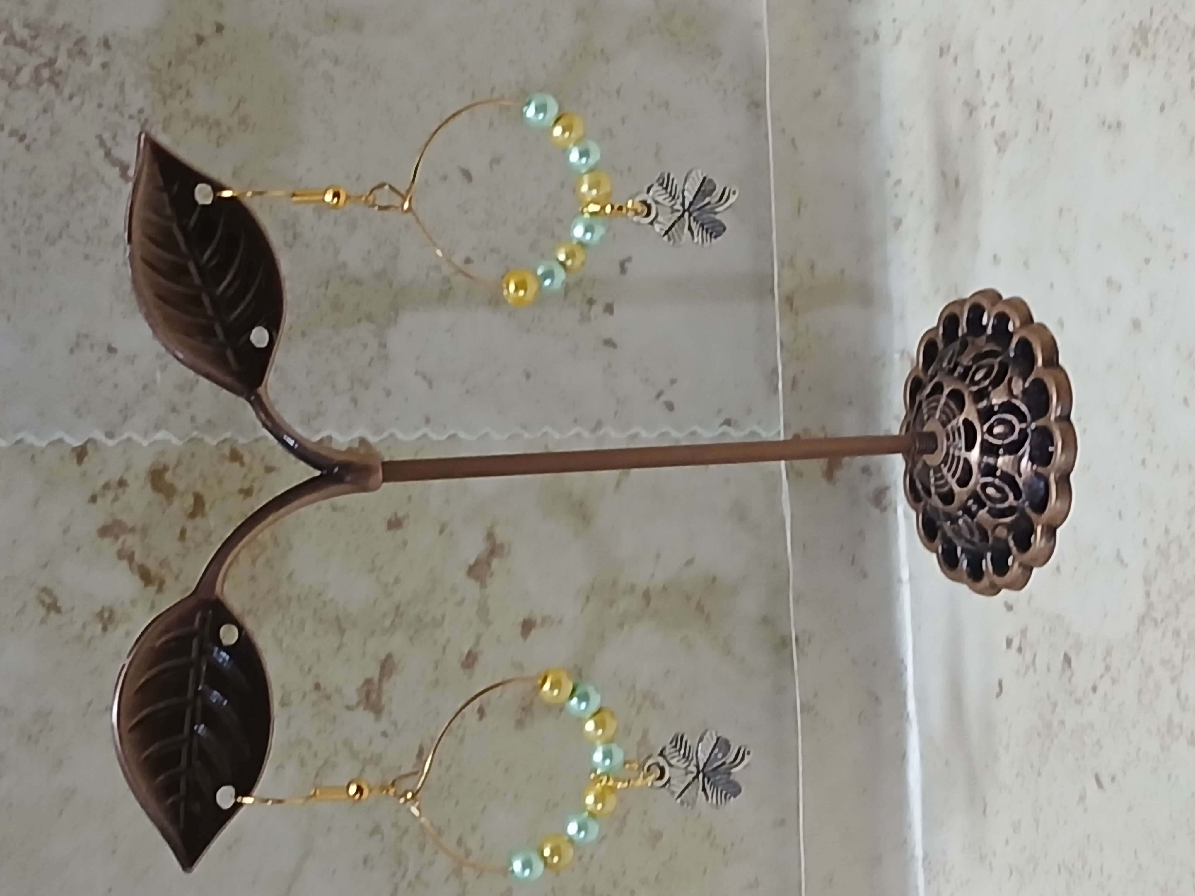 something different gold 1 inch hoop earrings with green and gold pearl beads with a silver shamrock hanging