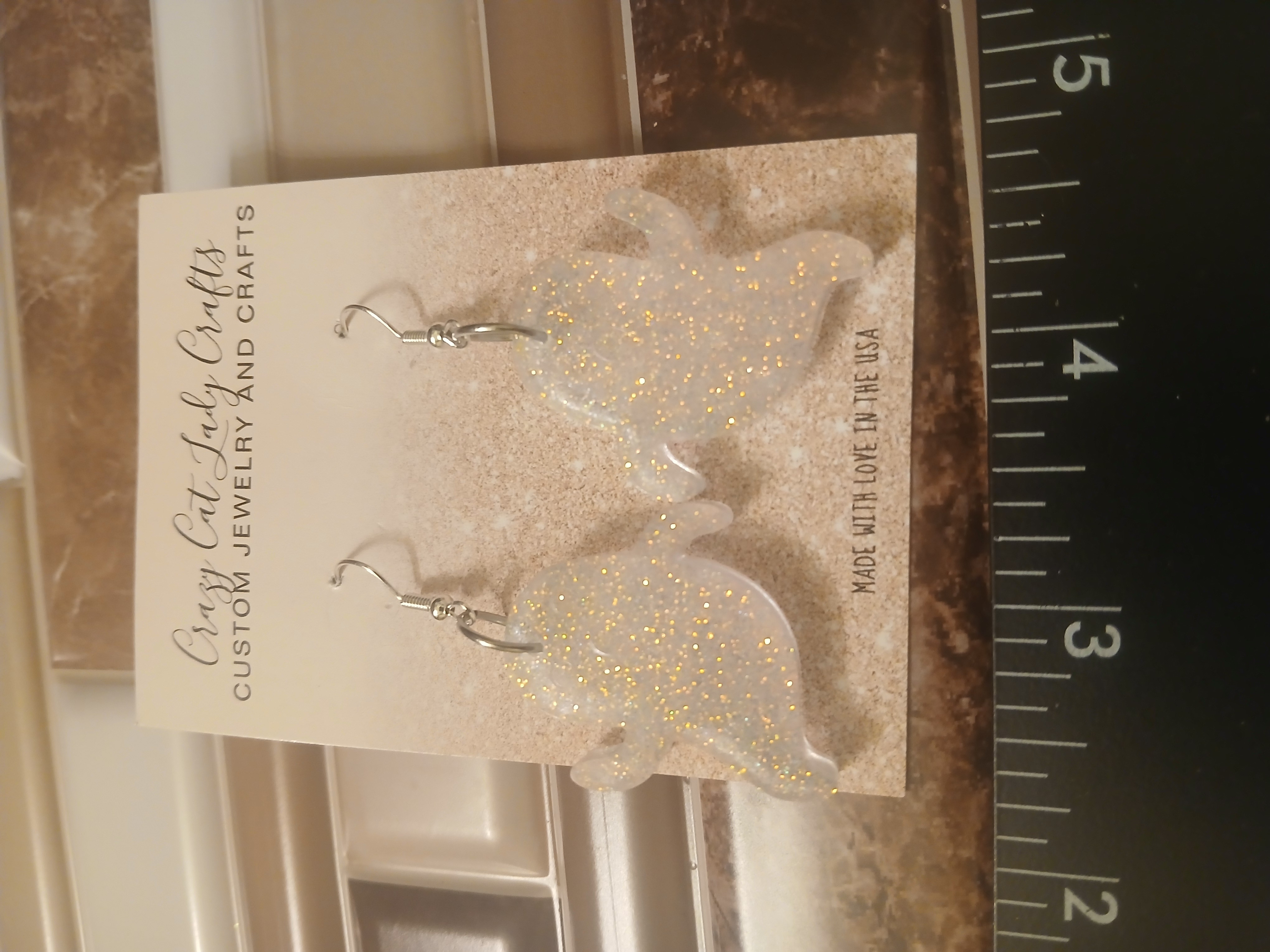 These spooky earrings can be customized by color glitter or glow in the dark one has both his both his arms up and the other has one up and one down there are hook earrings