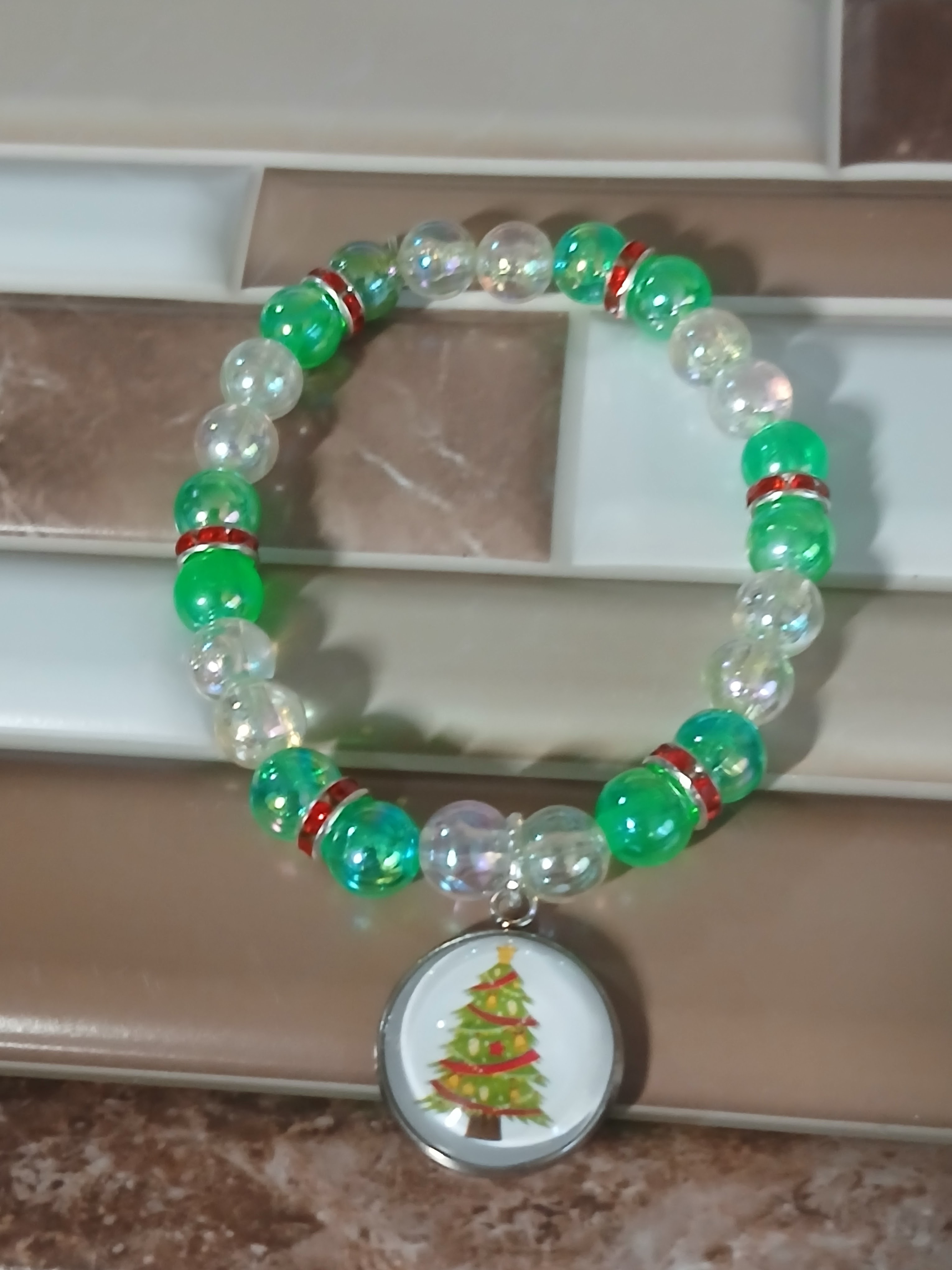 This festive Christmas strechy bracelet has green and white iridescent beads and red spacer beads and has a white charm with a decorated Christmas tree