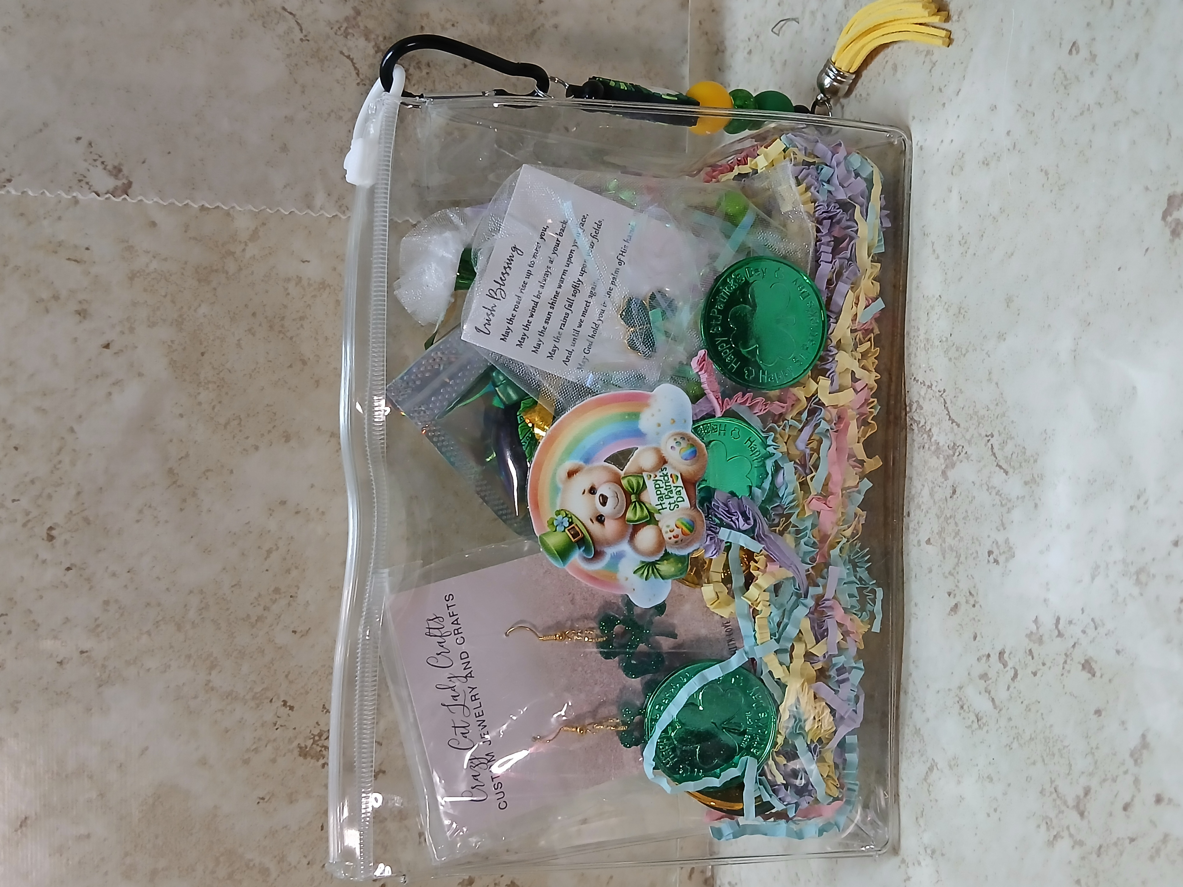 This bag is great for the Irish lass with earrings game pen Irish blessing lapel pin gnome key chain or use as a bag clip. all in a see thru bag with a rainbow with a bear dressed as Irish as can be with Happy St Patricks day sign