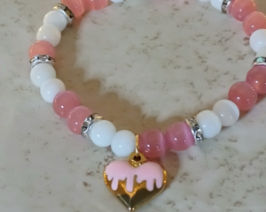 Pink and white cat eye bracelet with a gold and pink heart charm