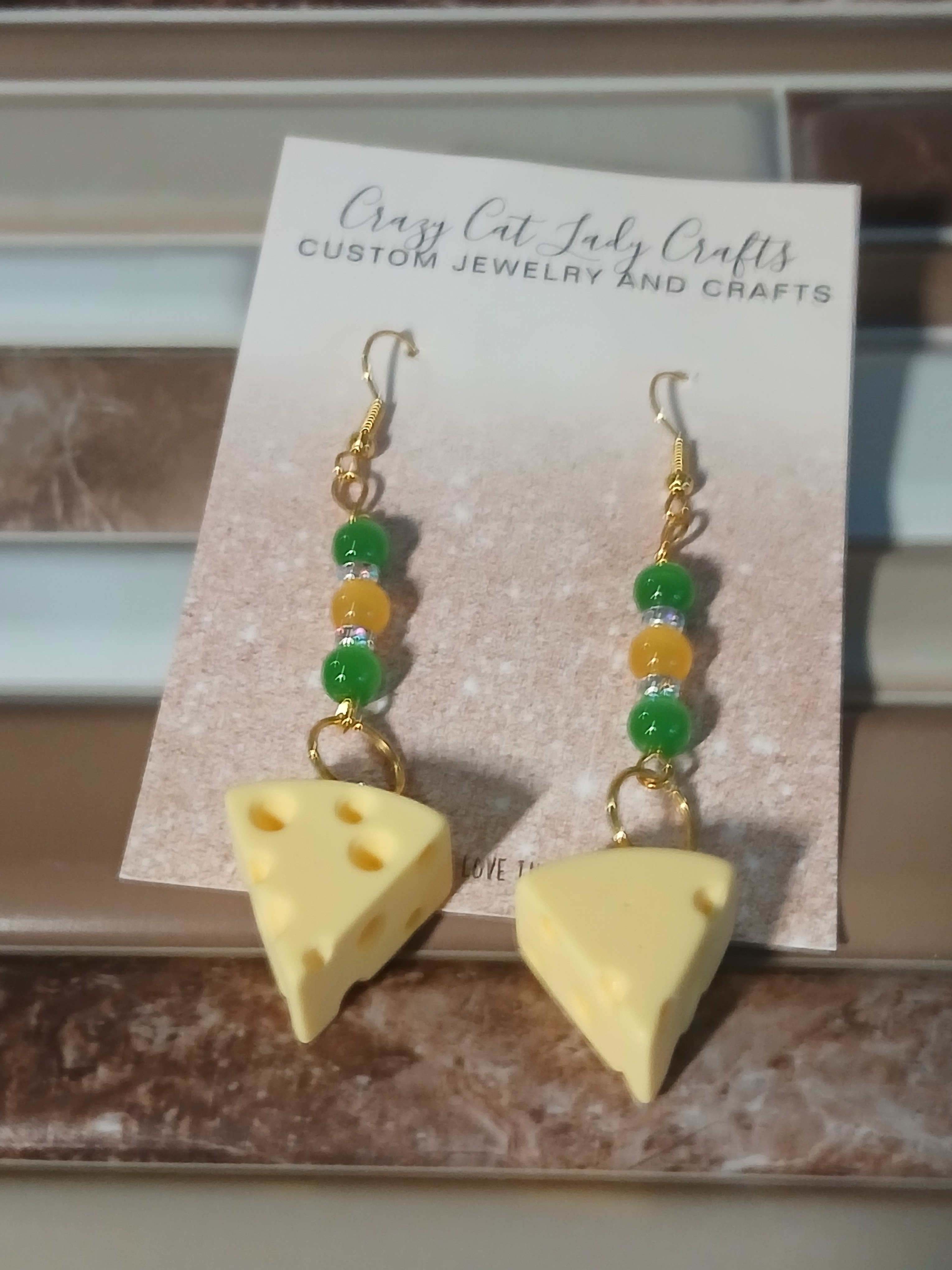 If you are a cheese head and love earrings these are for you. There is a green and gold beads and dangling is a slice of cheese all on gold hardware