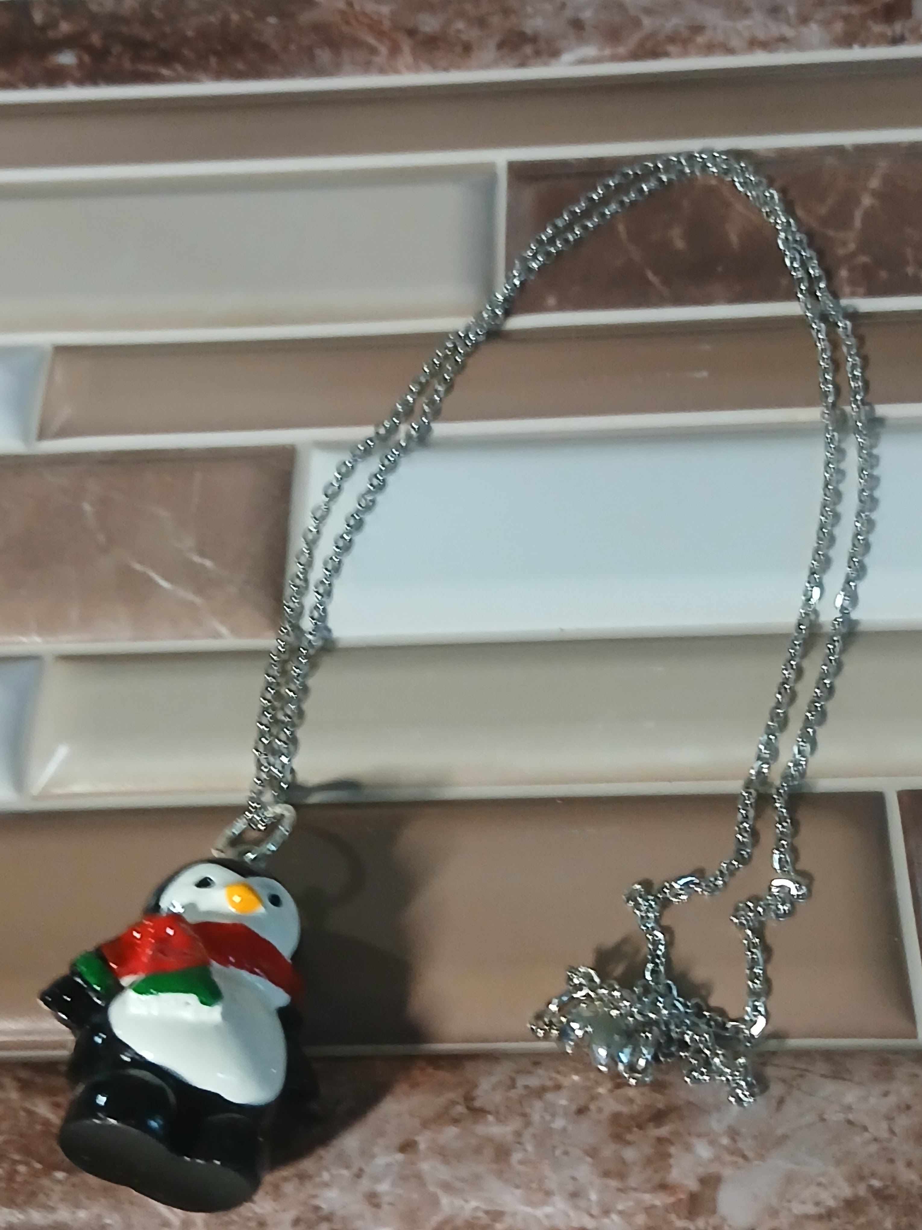 This 3d penquin has a red ribbon around his neck and is on a 24 inch silver chain with a magnetic closure ready for giving
