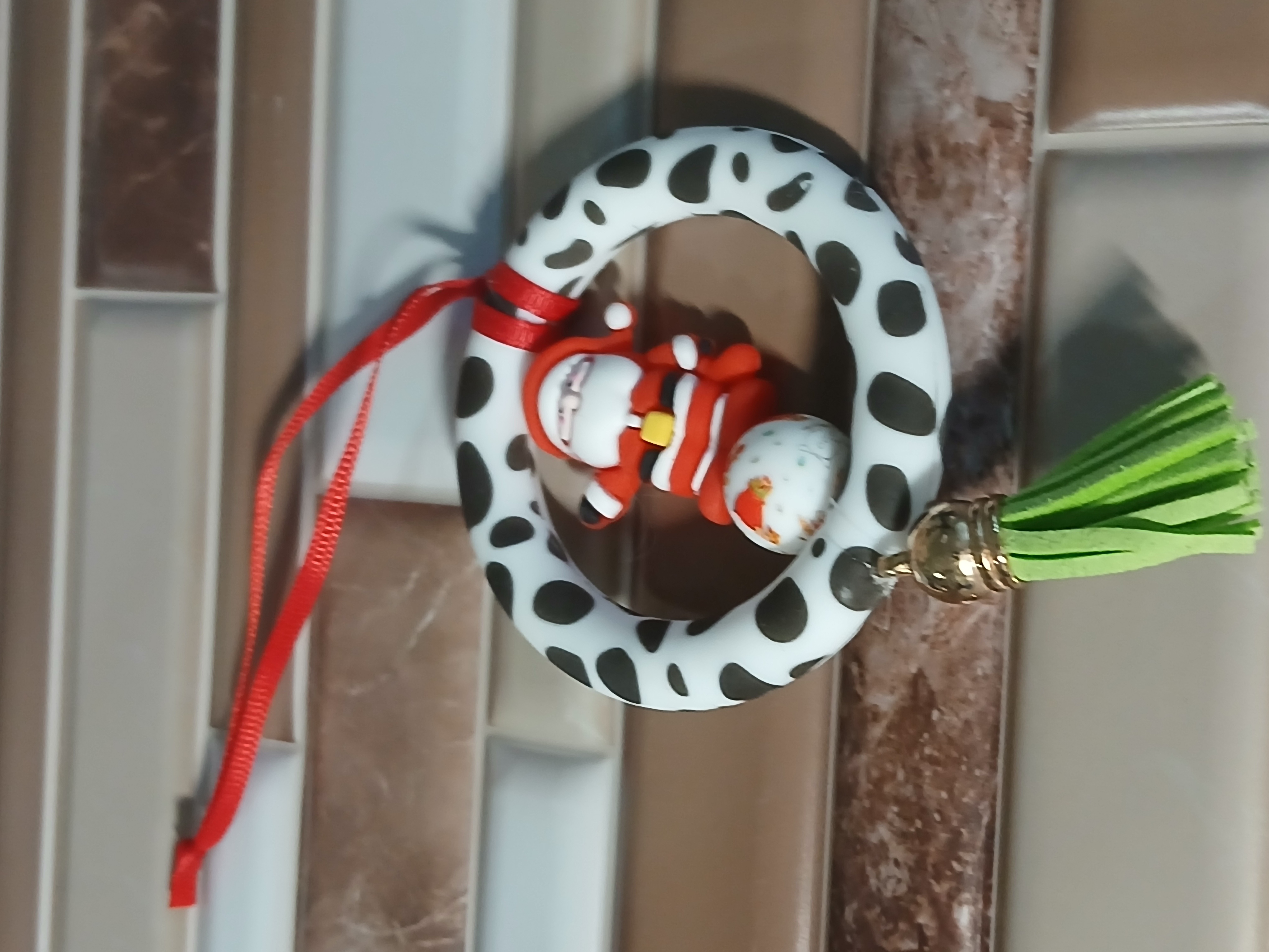 A food safe 65mm silicone ring has a Christmas beads and a Santa in the middle and a green tassel on the the bottom red hanger make this Christmas ornament a cute addition to your collection