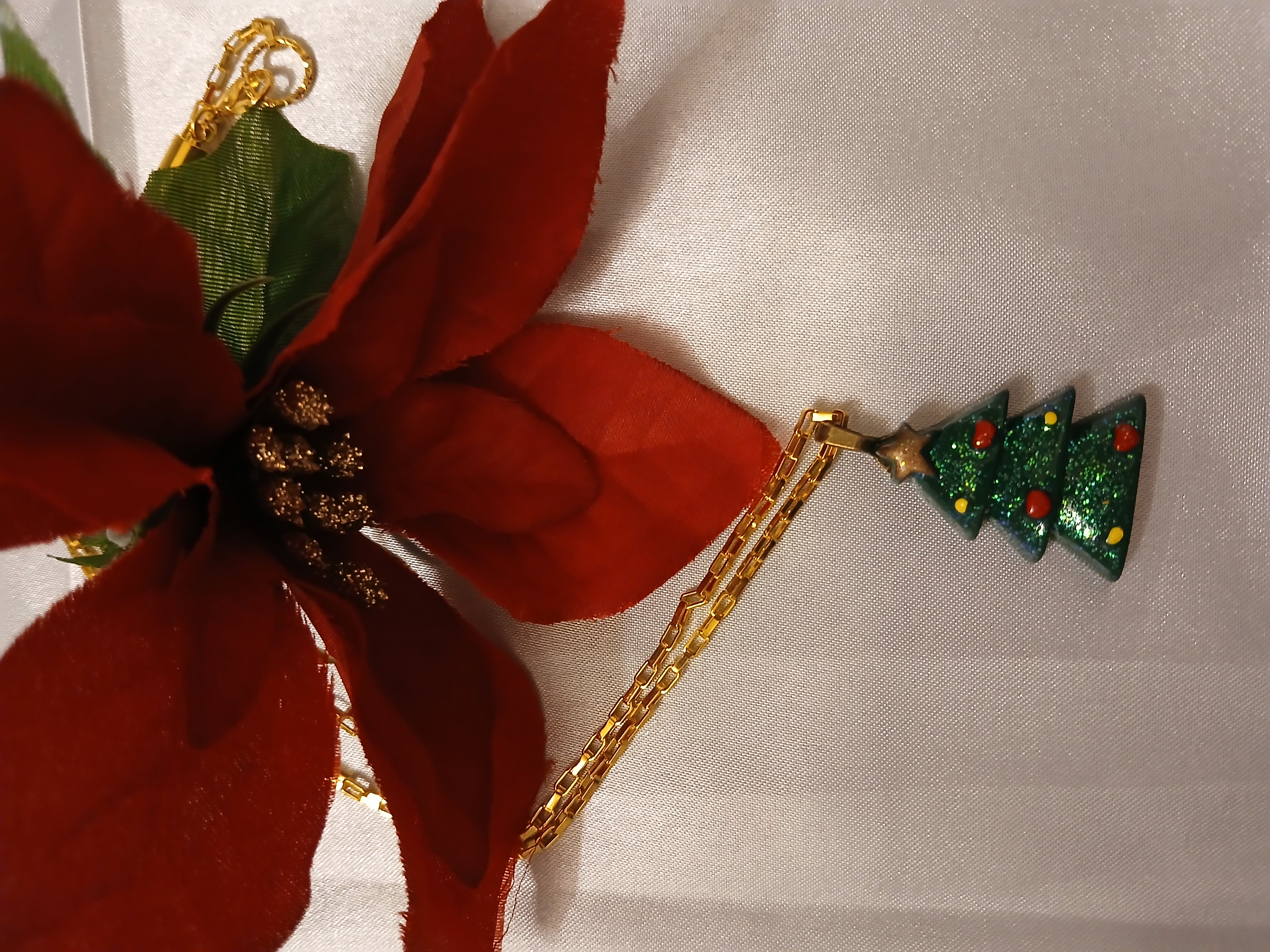 Green Christmas tree charm with red and yellow ornaments on a gold chain with magnetic closer