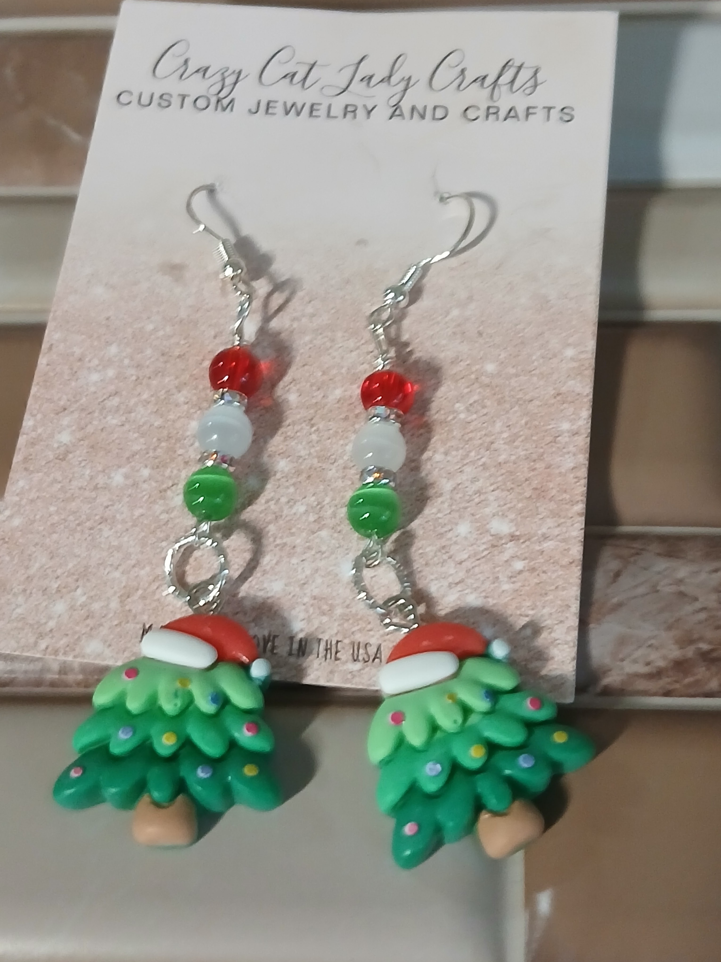 These festive Christmas earrings are of a Christmas tree wearing a Santa hat and has a red white green beads and white spacer beads on silver hardwware