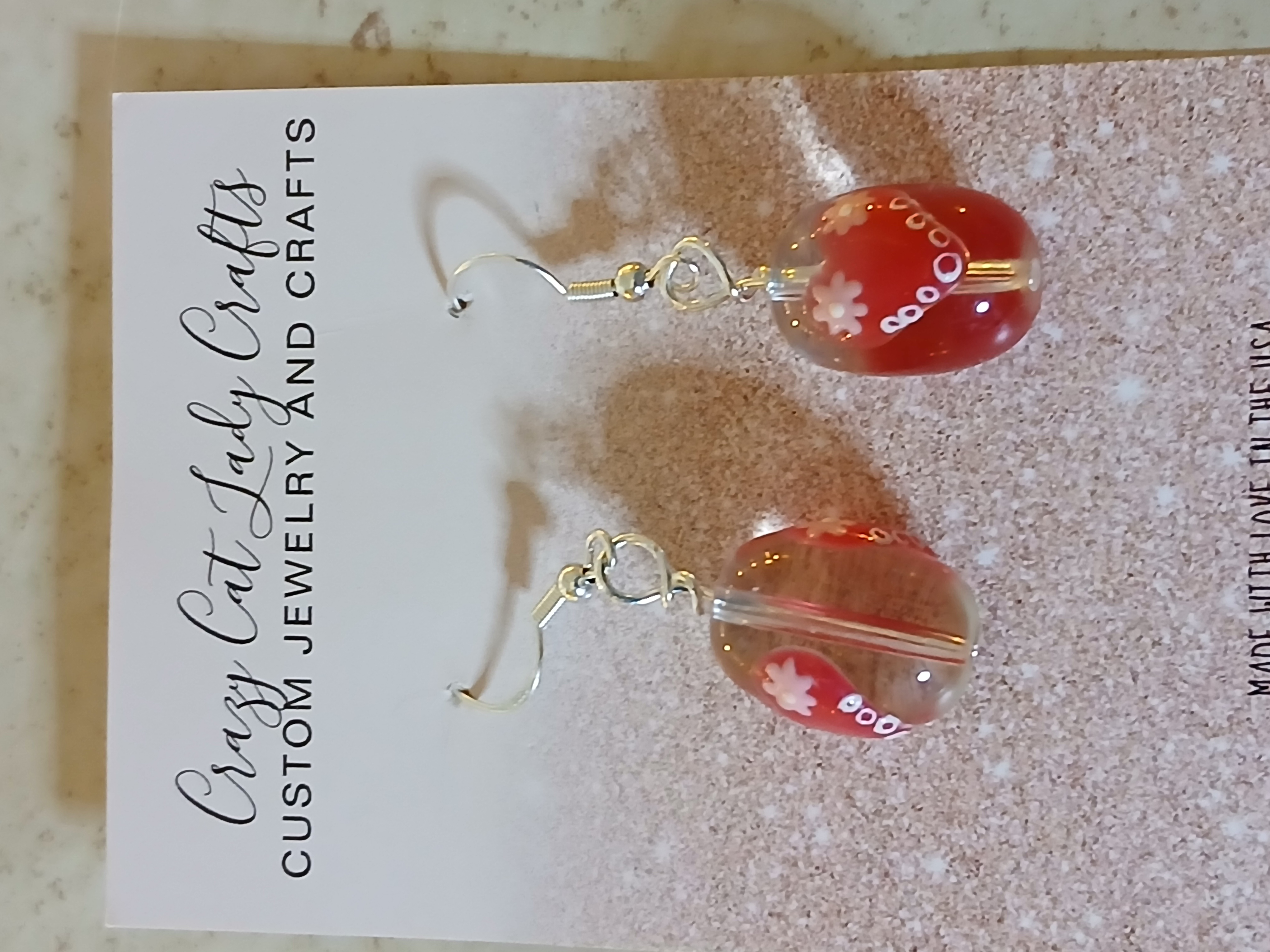 These clear oval earrings have a red and white heart on either side and are on silver findings great for Valentines day or just to say I love you