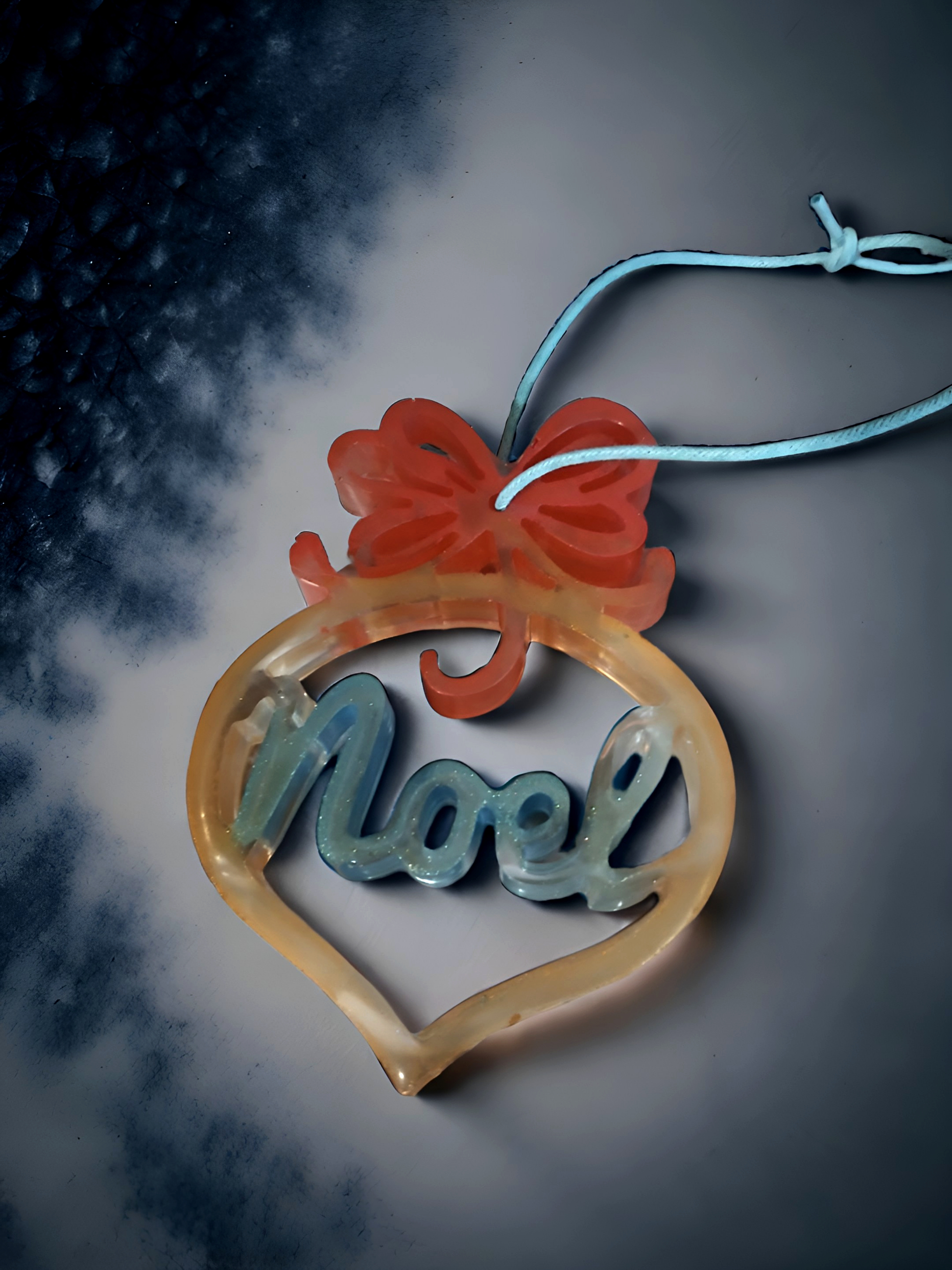 This custom Christmas ornament has Noel in the middle and a ribbon ion top it is made of resin and can be totally customized by color and if you want glitter you can even have different colors in the ornament