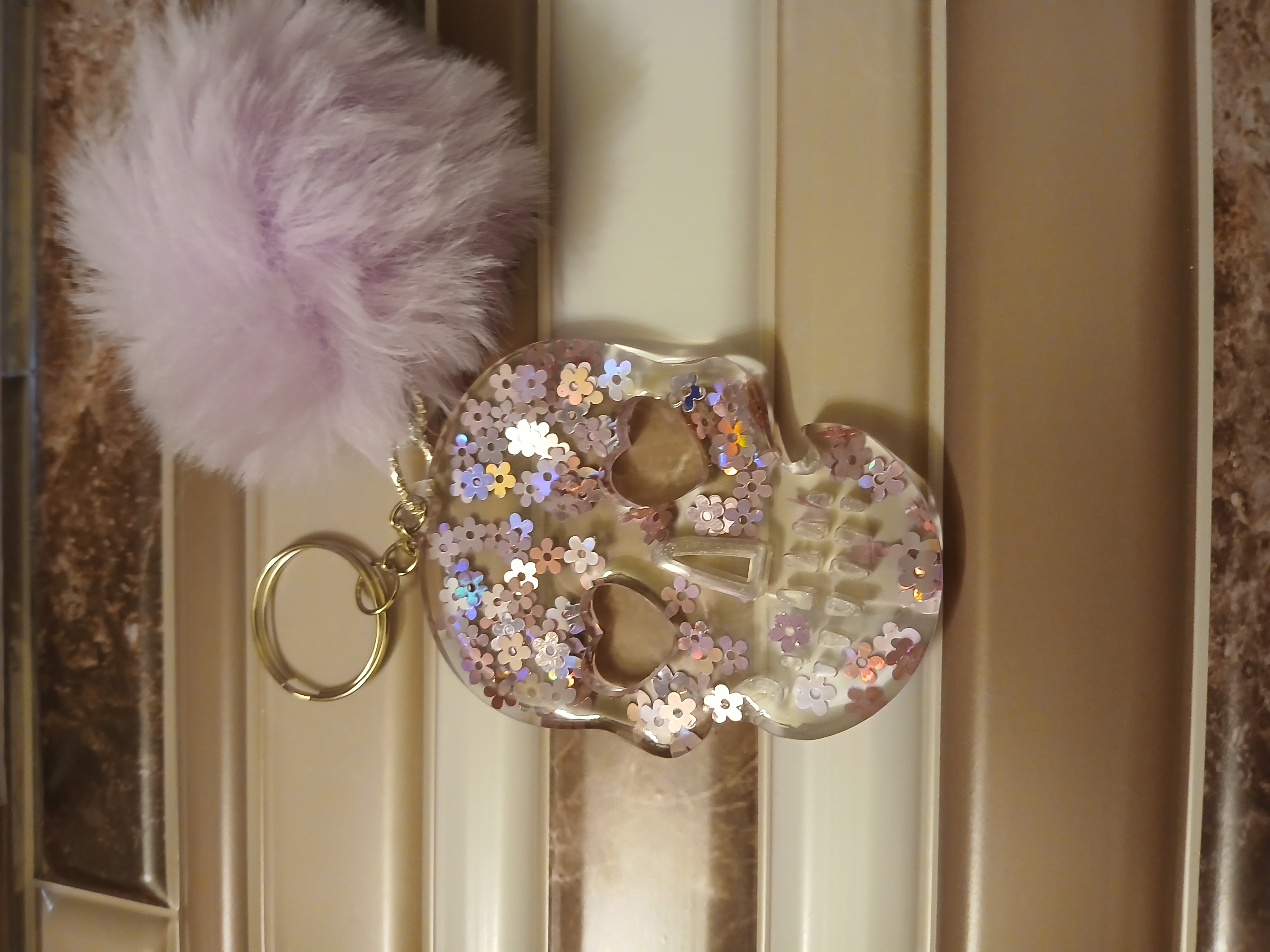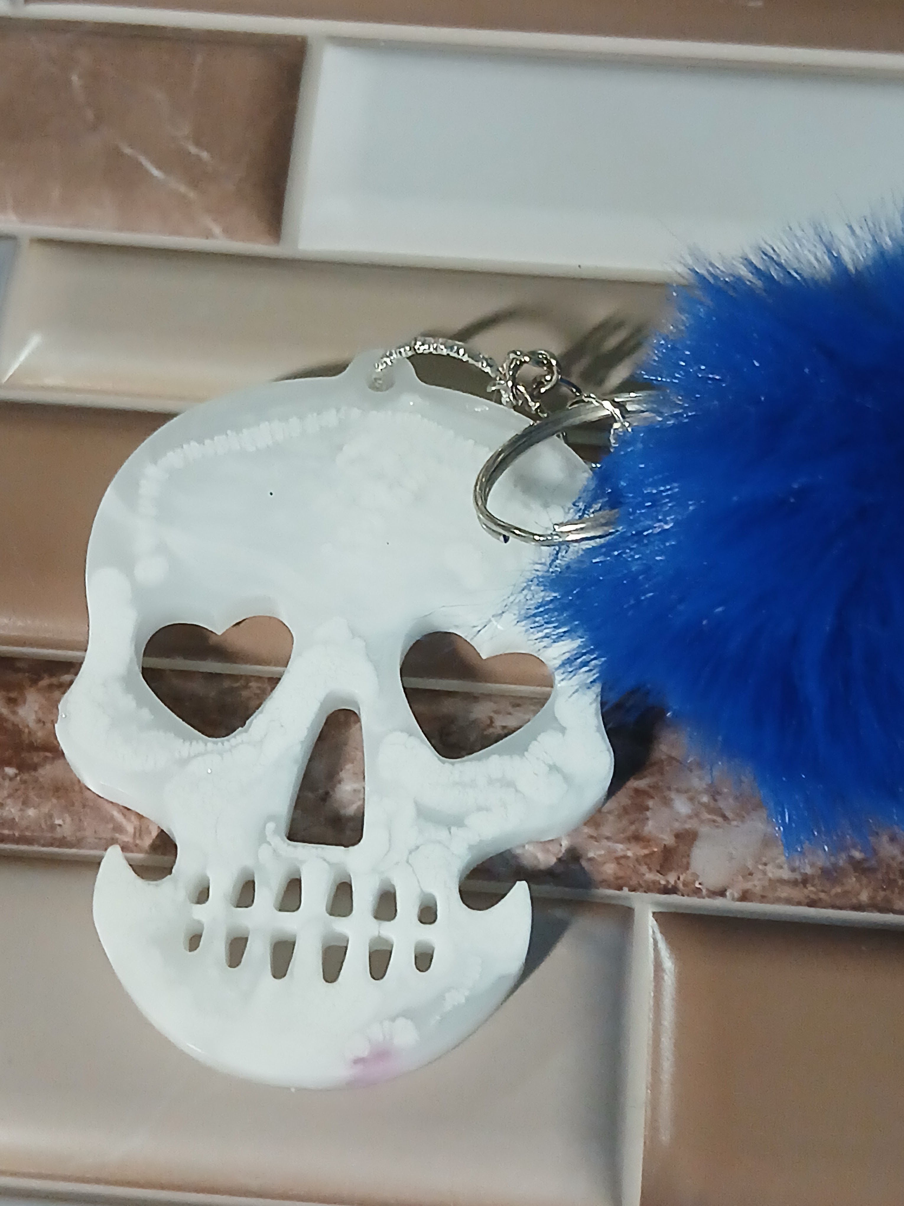 A skull with heart shaped eyes and a pom pom attached keychain can be customized by color and if you want chameleon glow in dark effects.