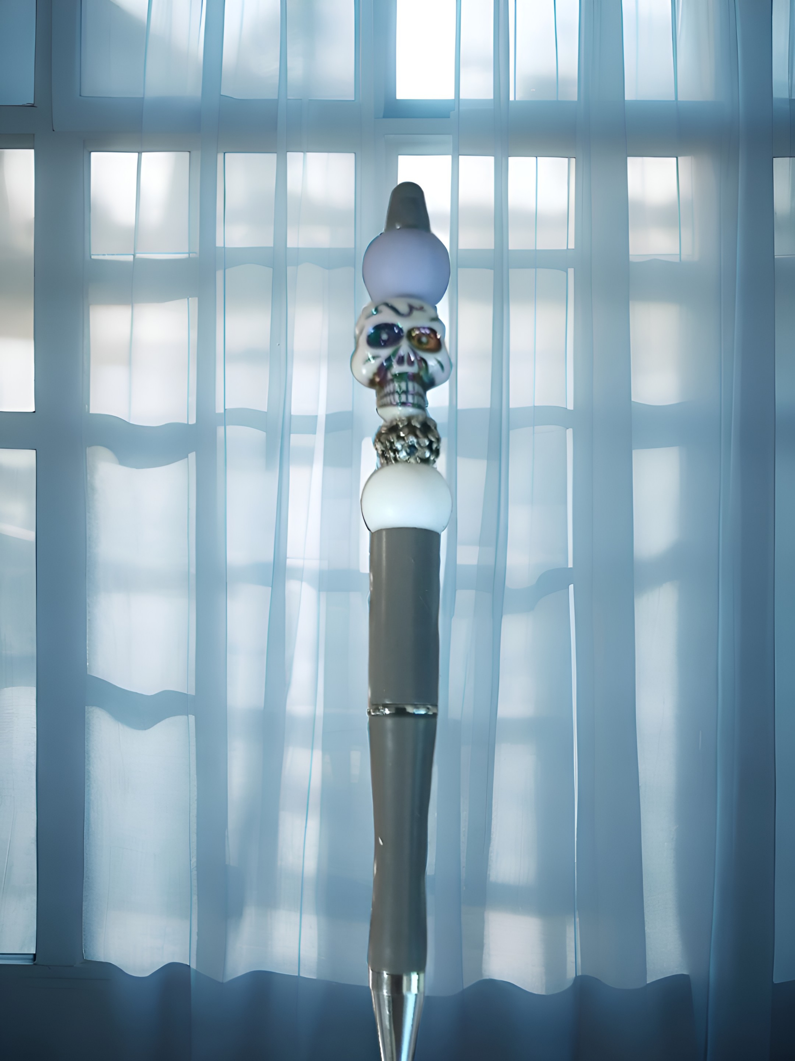 This scary skull pen is on a gray barrel and has grey black and white beads the black has rhinestones on it great for Halloween