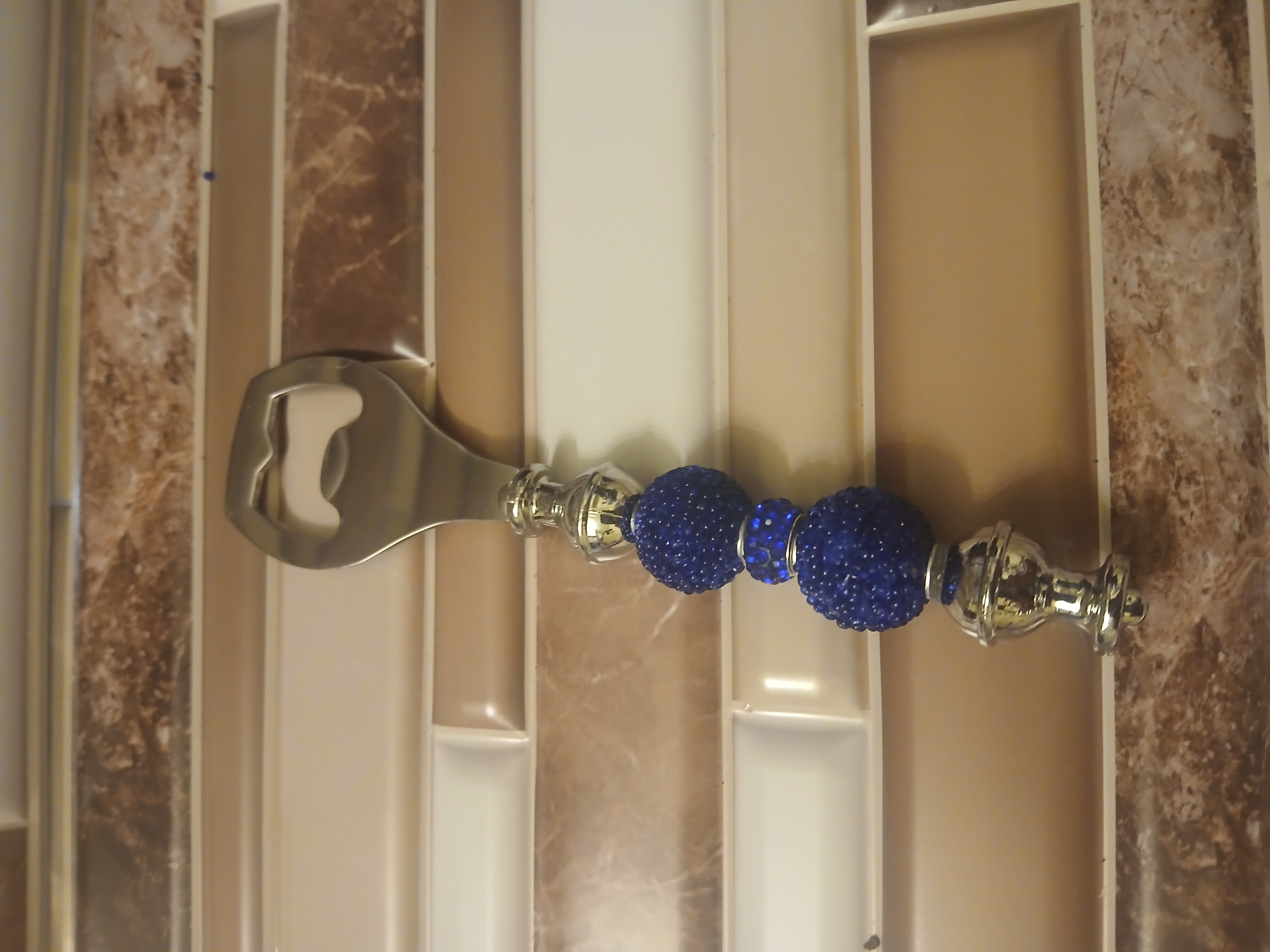 This fancy silver and beaded royal blue bottle opener is great for any bottle of beer or soda great