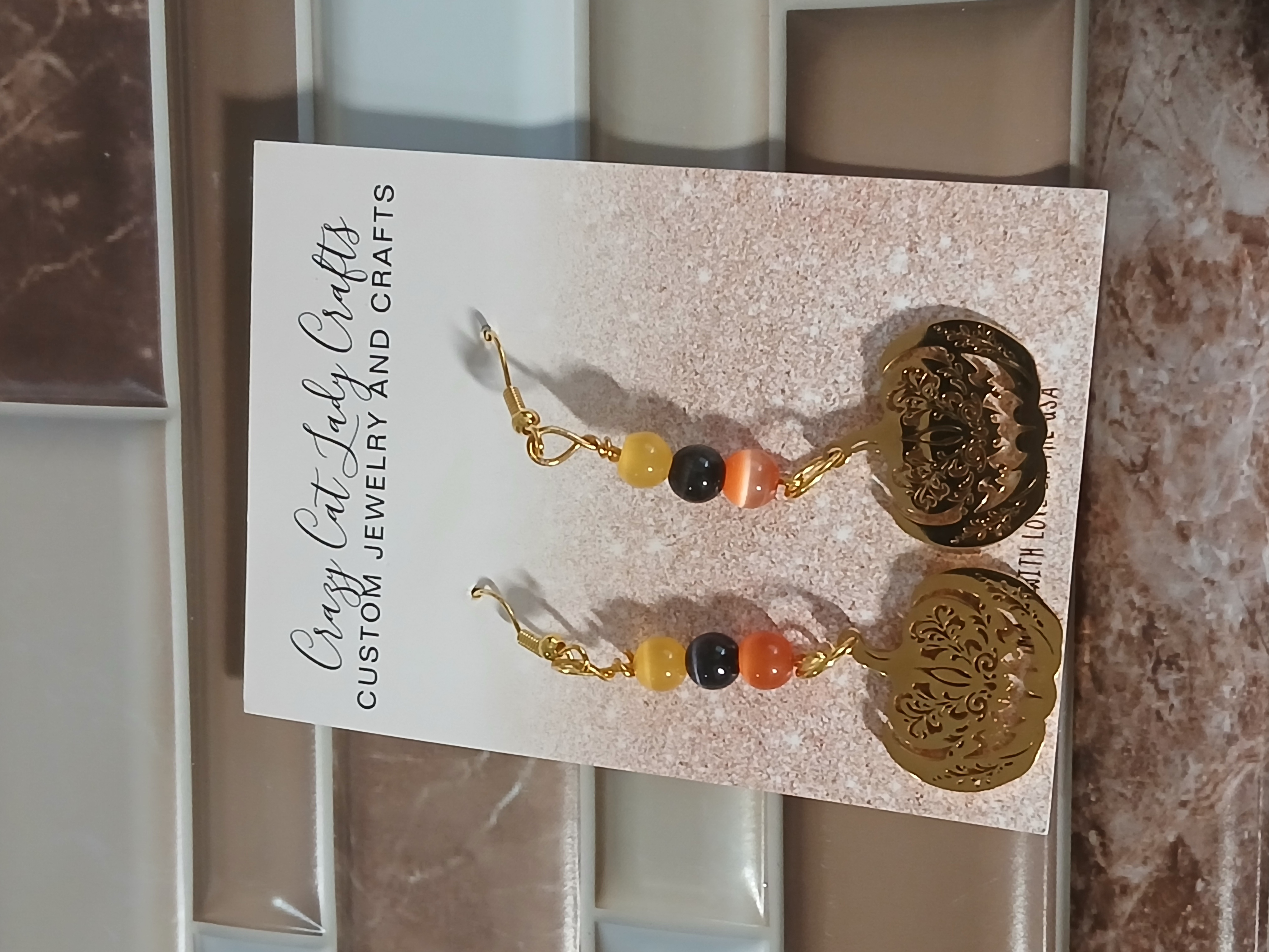 These gold pumpkin earrings have a gold black and orange beads all on gold hardware you will love to display these earrings on your ears for that spooky season
