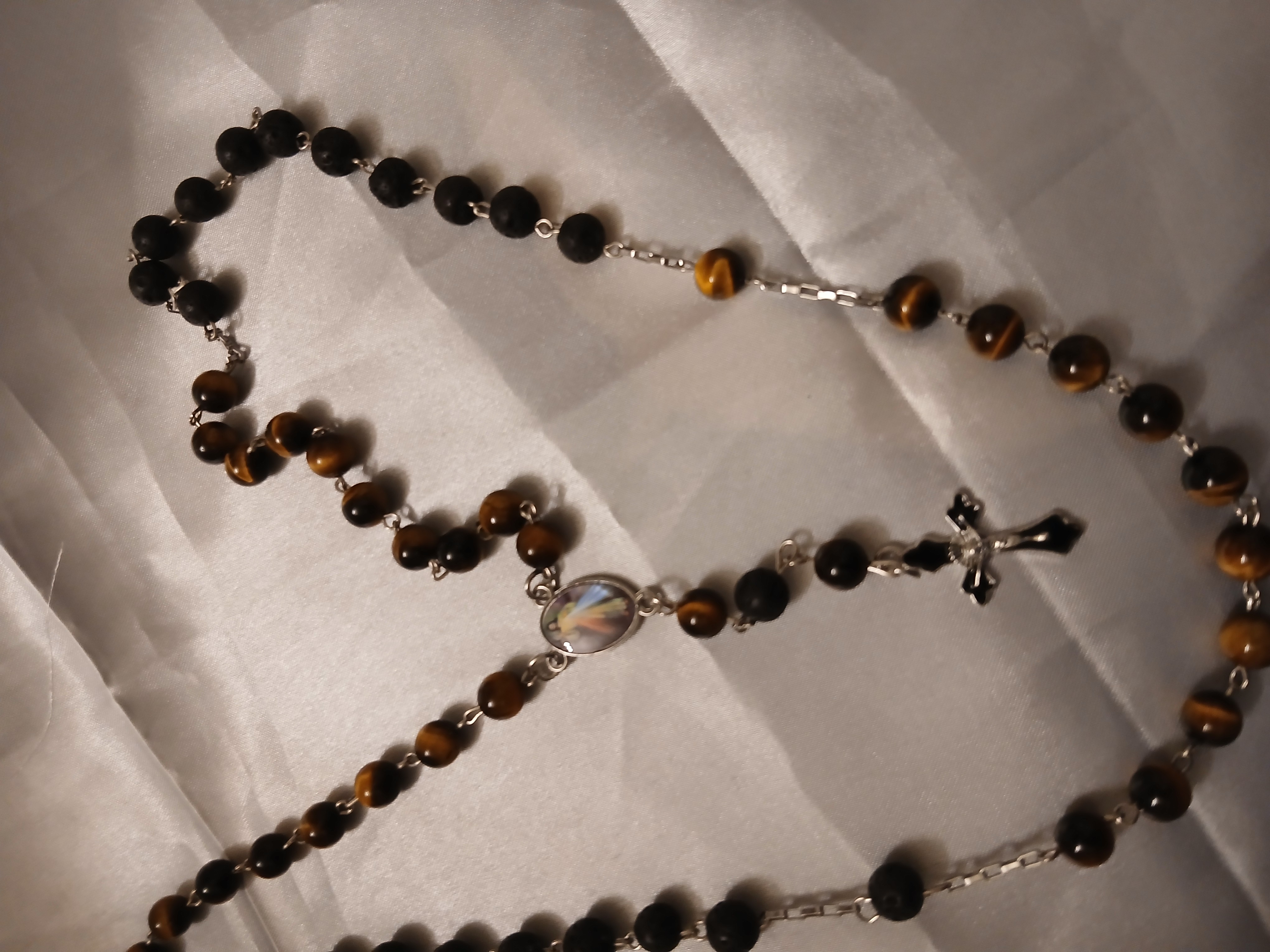 Handmade made with your choice of beads cross color and middle with a religious picture. A great gift for any catholic any occasion even just for no occasion.