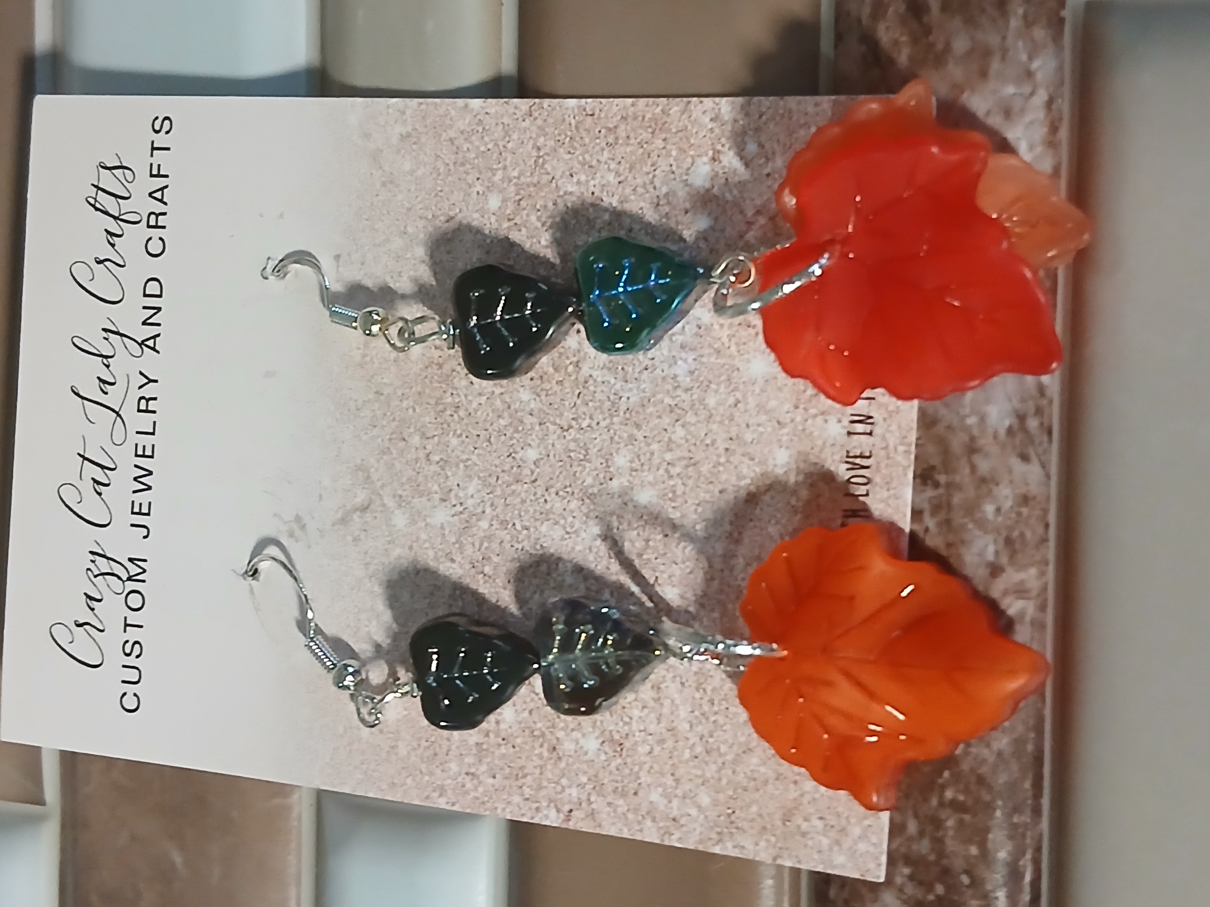 We have all heard of the sky is falling but how about the hearts and leaves are falling? There are 2 electroplated dark heart beads and 3 different shades of orange charms handing down. Make these earrings are great for fall Halloween and Thanksgiving