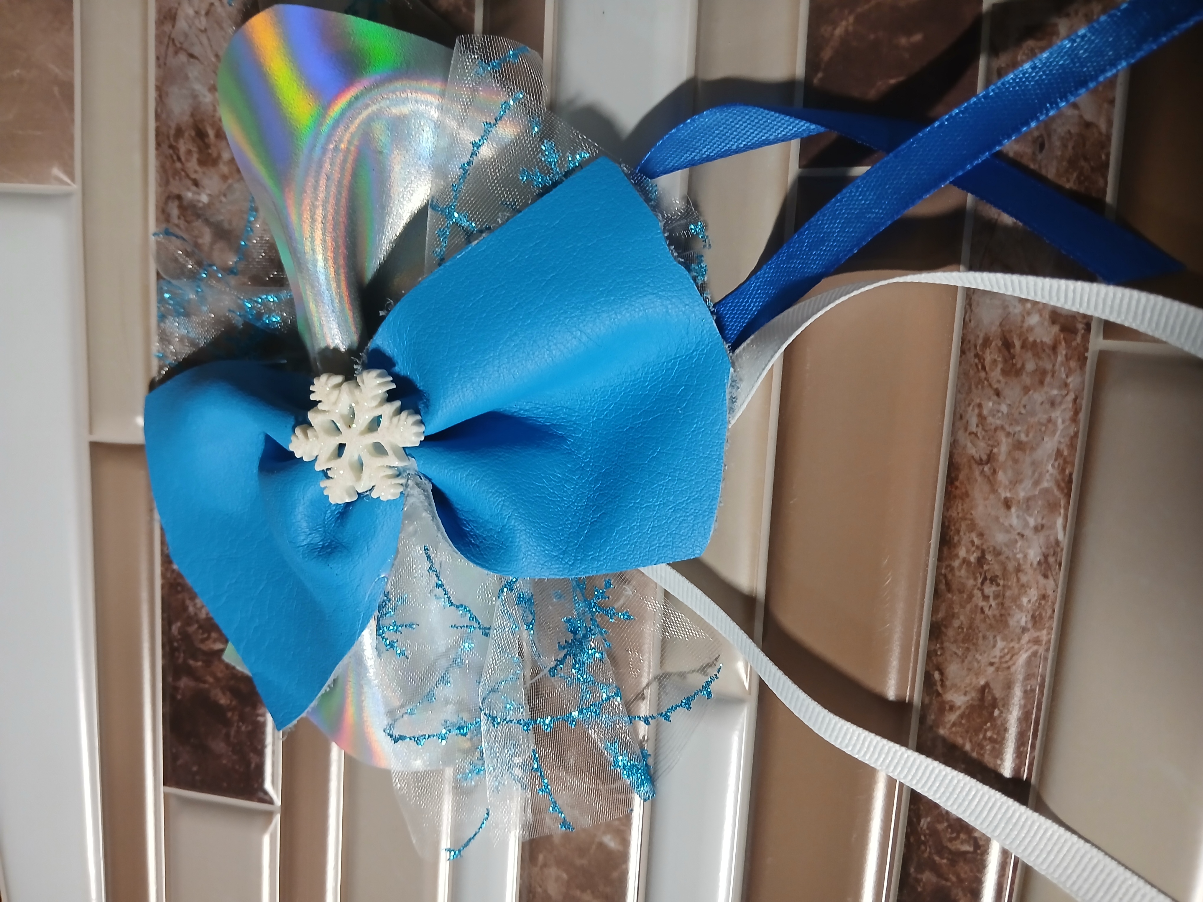 This large faux blue and silver leather Christmas bow has a white snowflake in the middle and blue and white ribbons hanging down and has a snap clip and white tulle with blue snowflakes