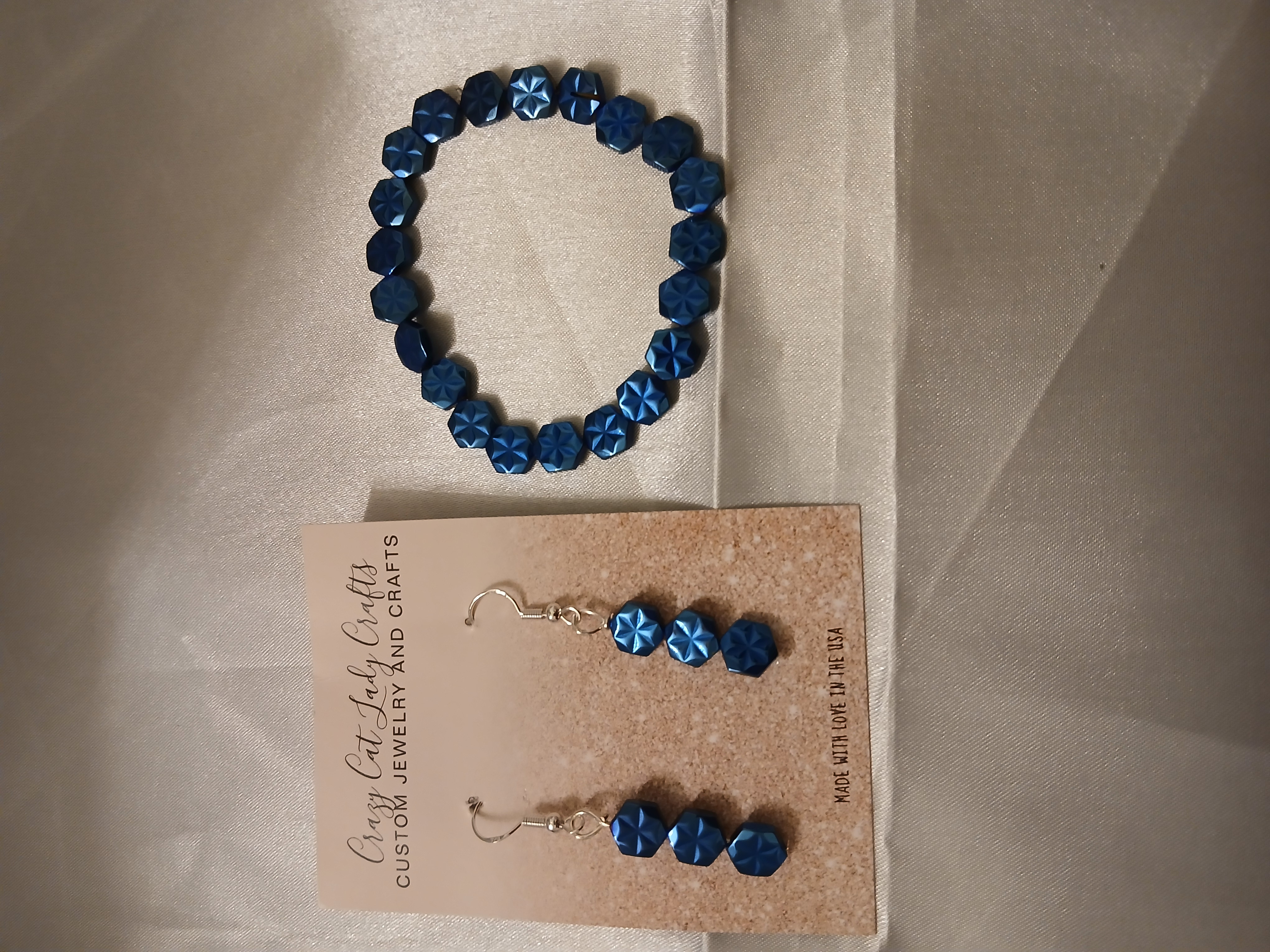 Metallic blue flower shaped flat beads make up this 2pc jewelry set of a bracelet and matching earrings great for the office or a night out