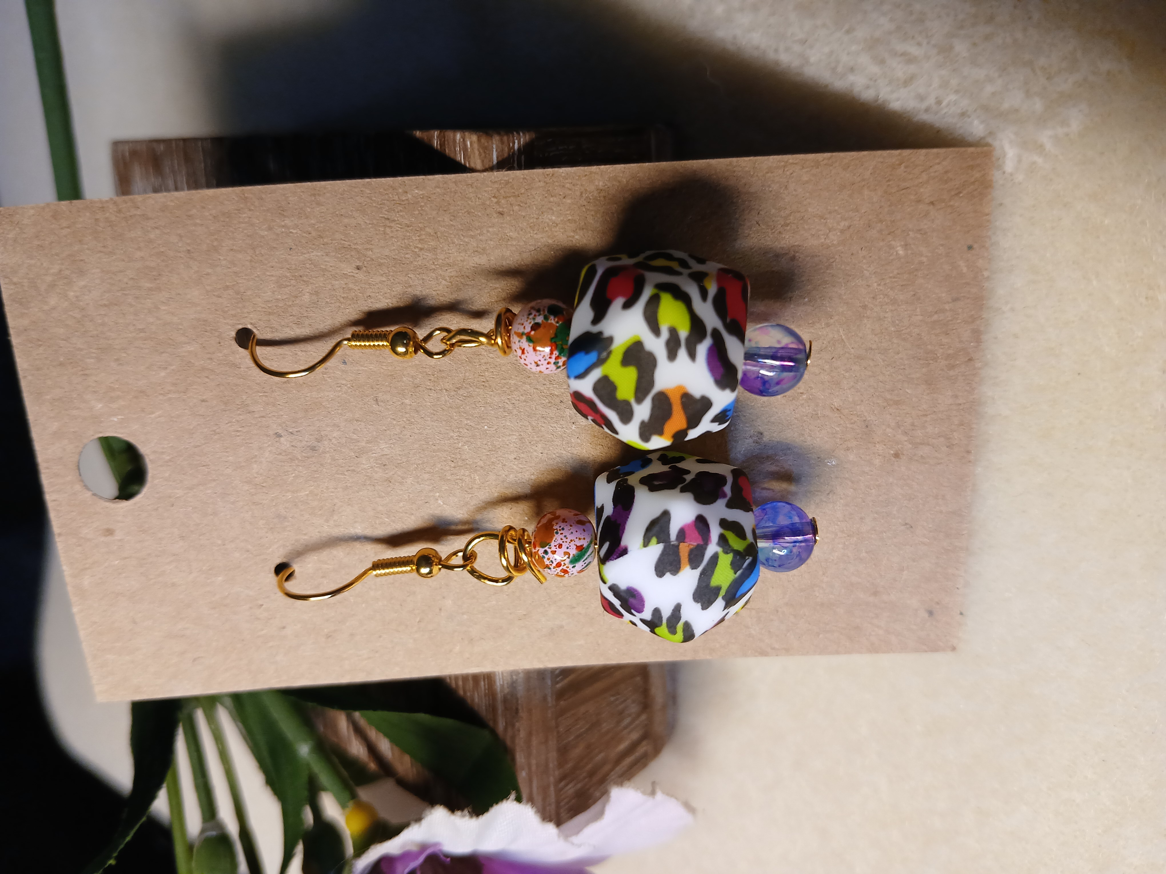White multi colored leopard silicone geometric shaped earring with a pink multi colored bead and bluish purplish bead