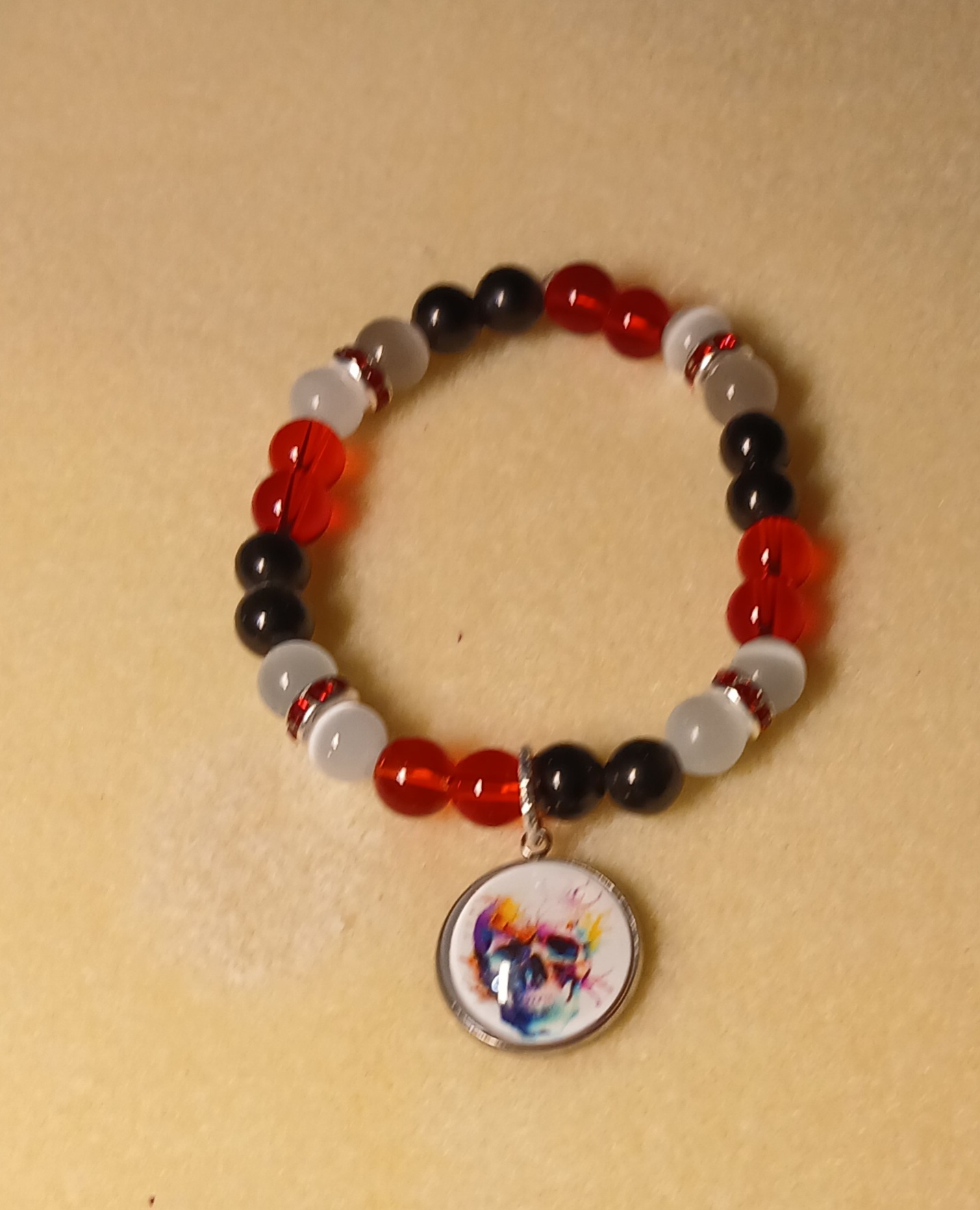 Scary looking skull that has many colors splattered charm and has red black and white beads with red cut rhinestones spacers