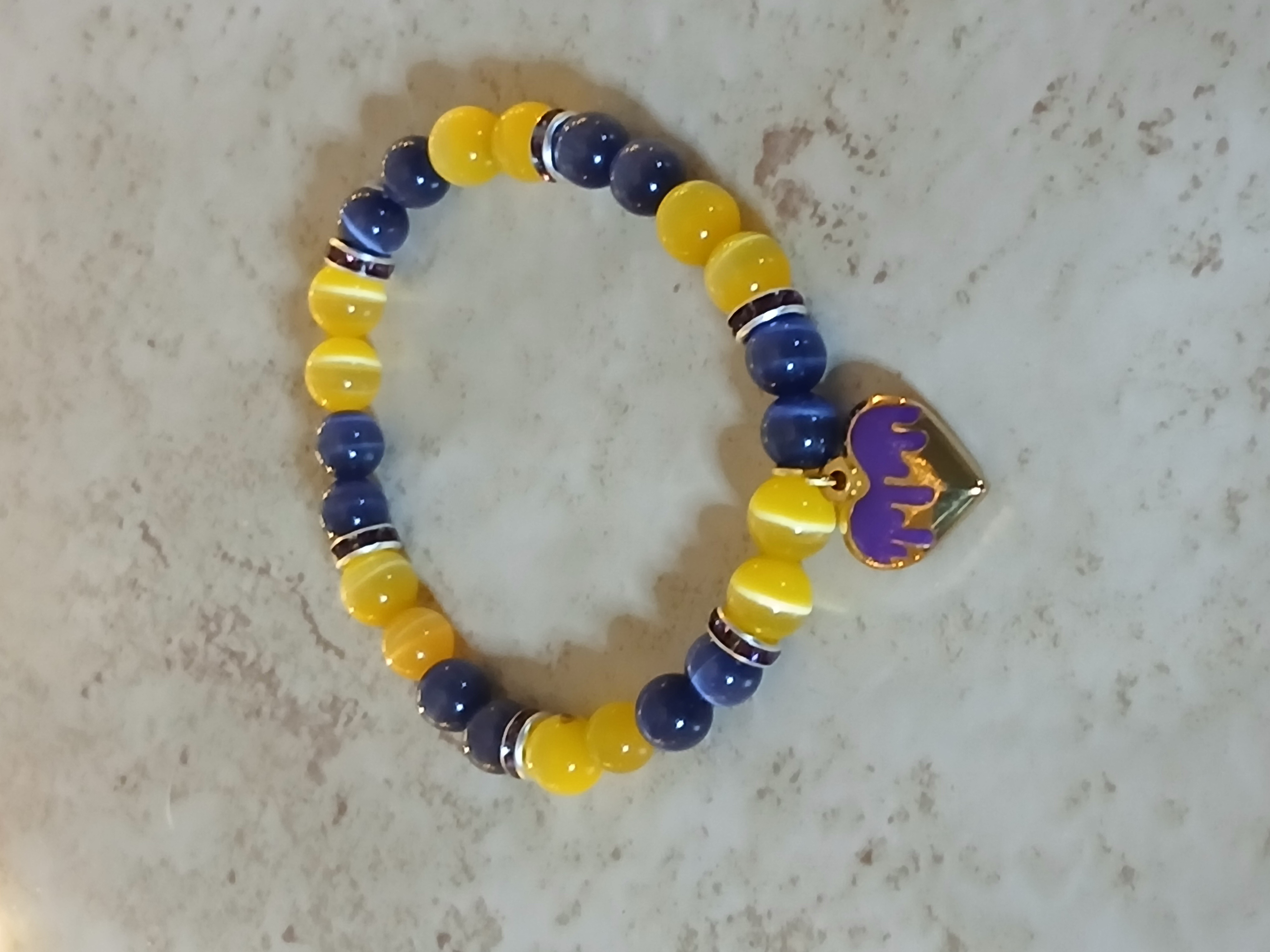 Purple and gold cat eye beads with dark purple rhinestone spacers make this bracelet elegant enough but then add a gold and purple heart and it is just stunning