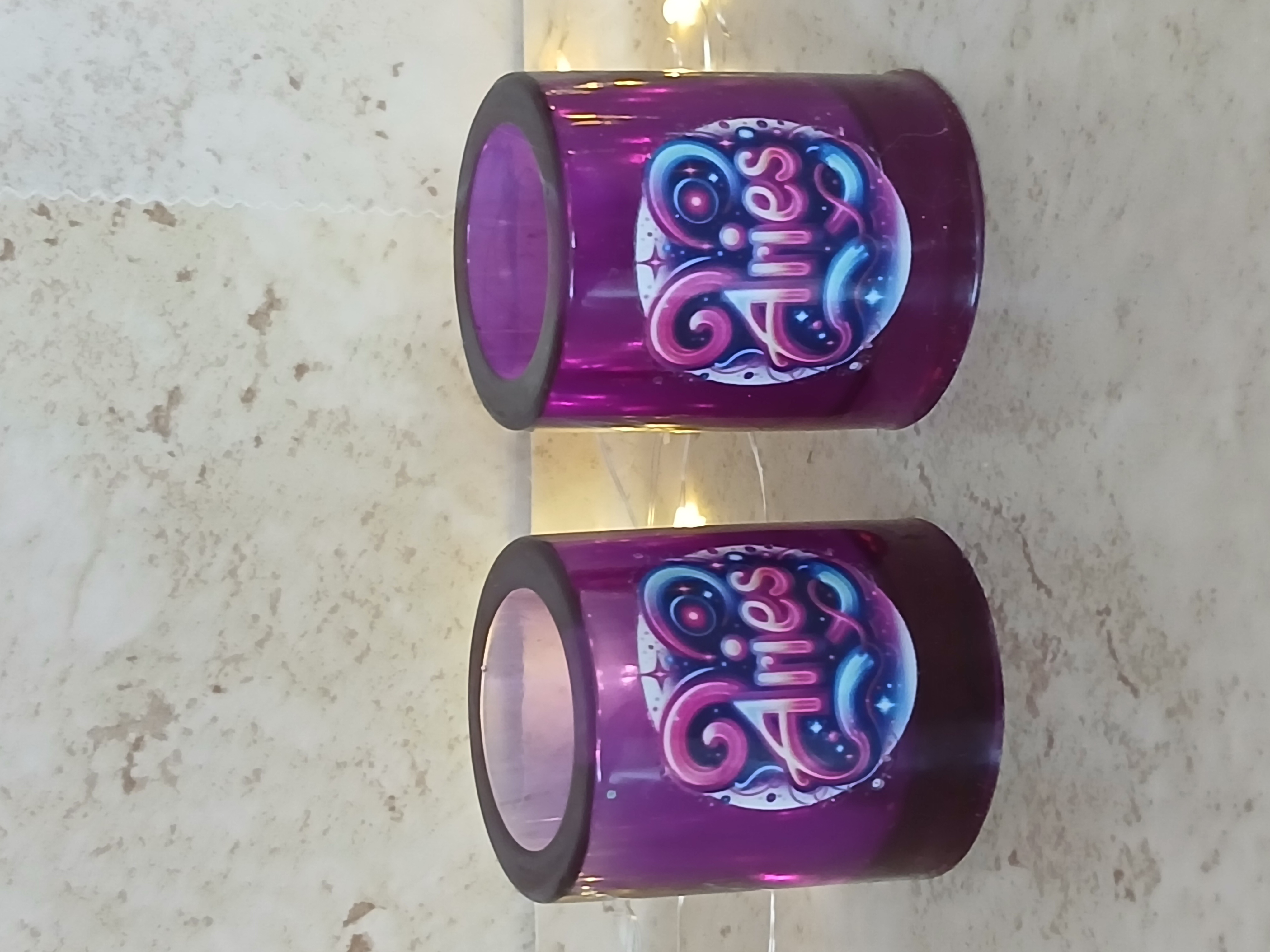 Purple clear pair of shot glasses made of food safe resin with an Aries design on it Great for display or drinking