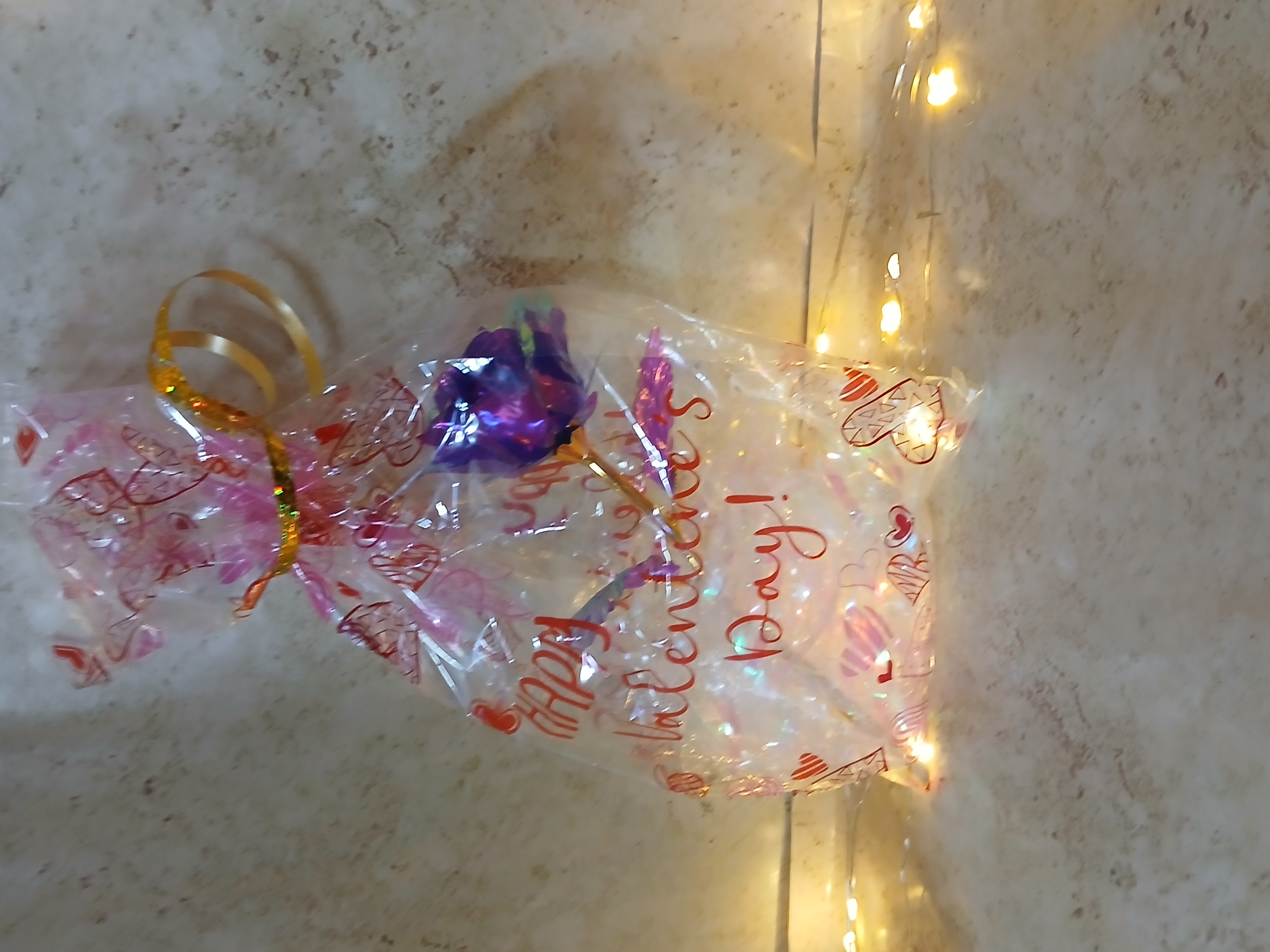 This is called the Galaxy or Forever Rose because its metallic blue with gold accents and is iridescent. I is in a Clear Happy Valentine's Day treat bag and decorated festive