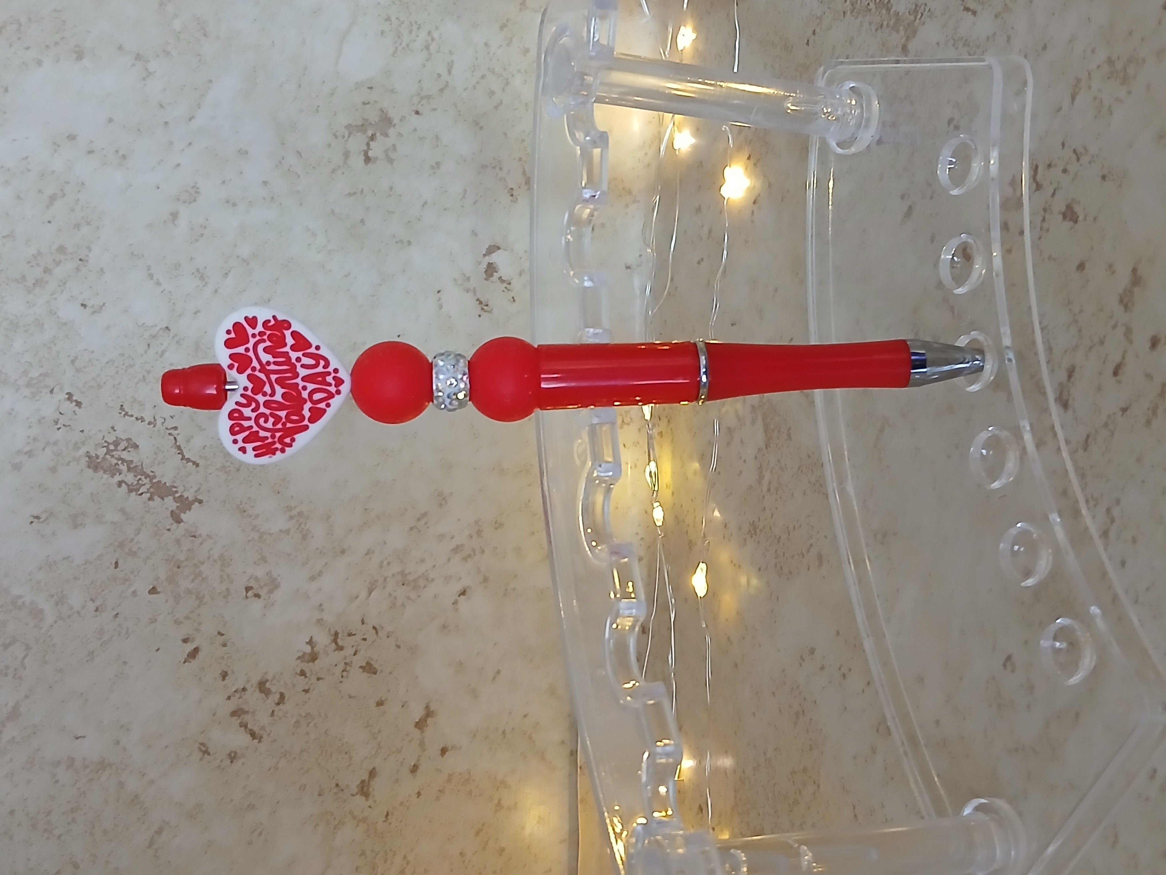 Red and white heart that says Happy Valentines Day on top of red silicone beads and a red pen just a little thing to say I love you