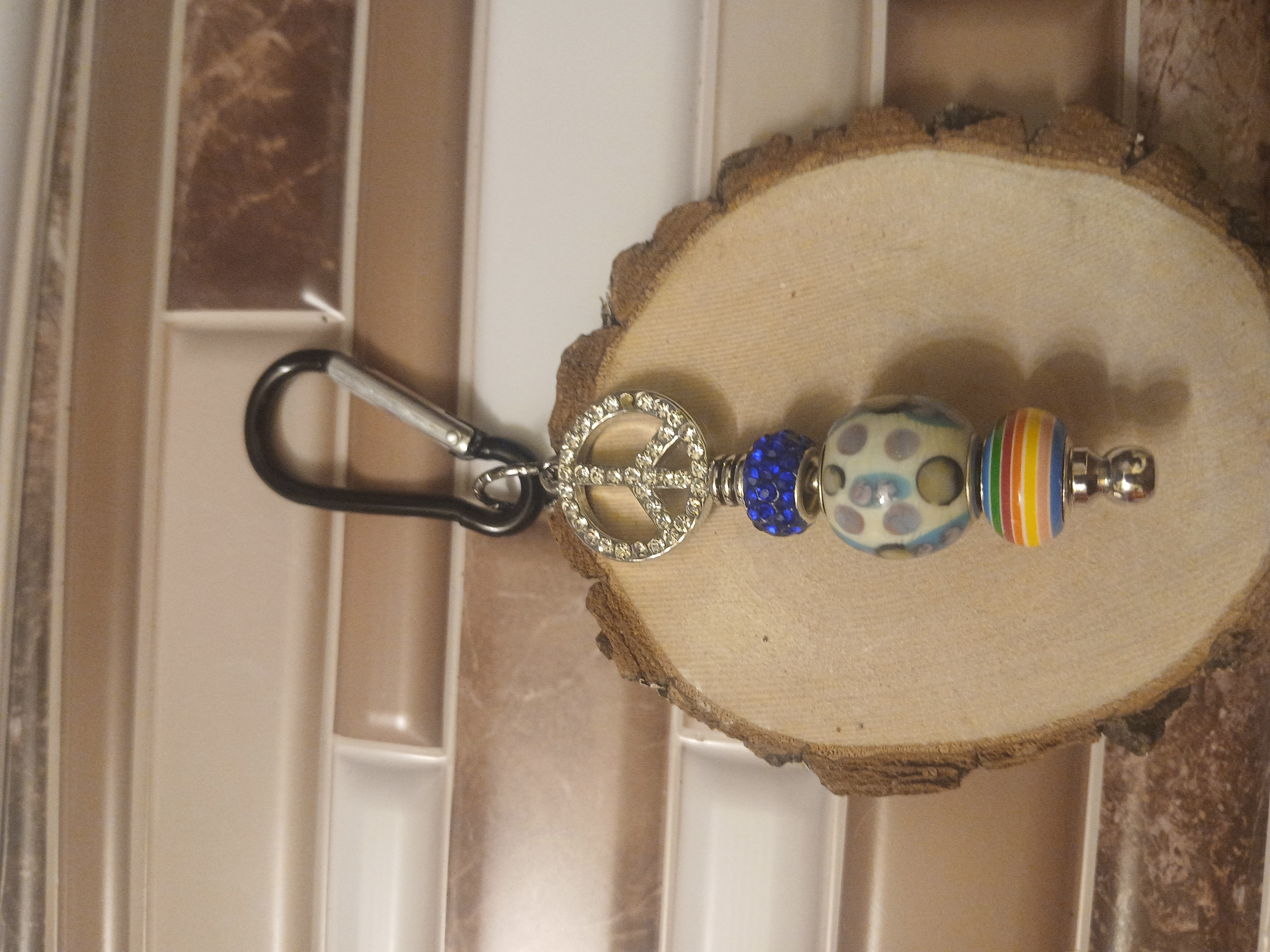 Silver Peace sign made of rhinestones at added to wild colored beads on a beaded key chain or bag decoration