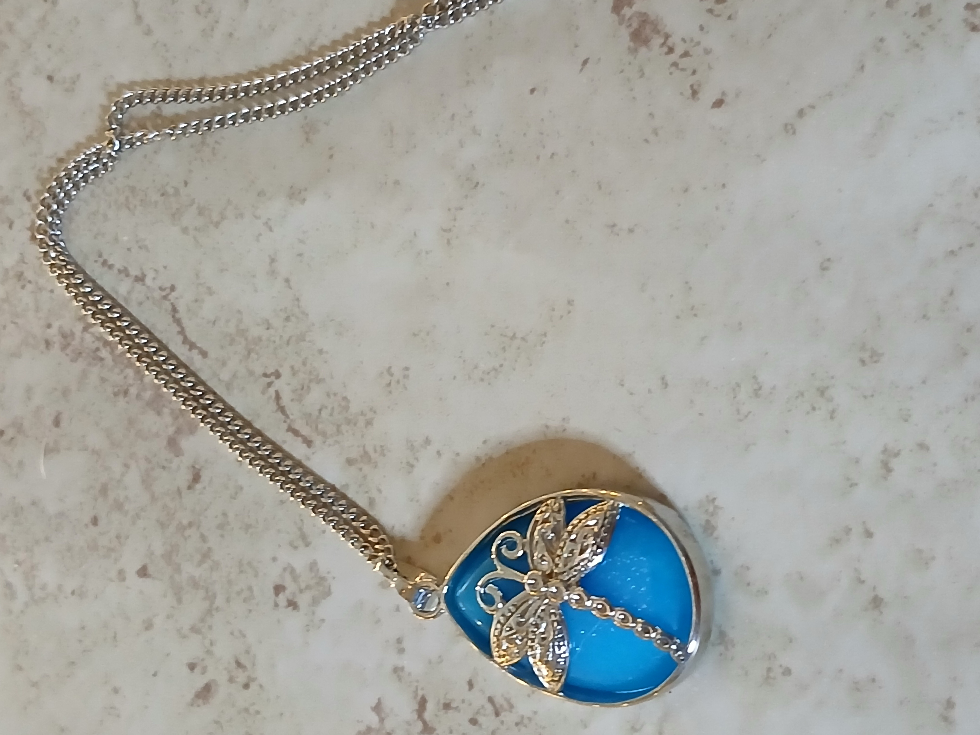 Teardrop shaped pendant in silver and blue stone of a dragonfly on 18"silver chain