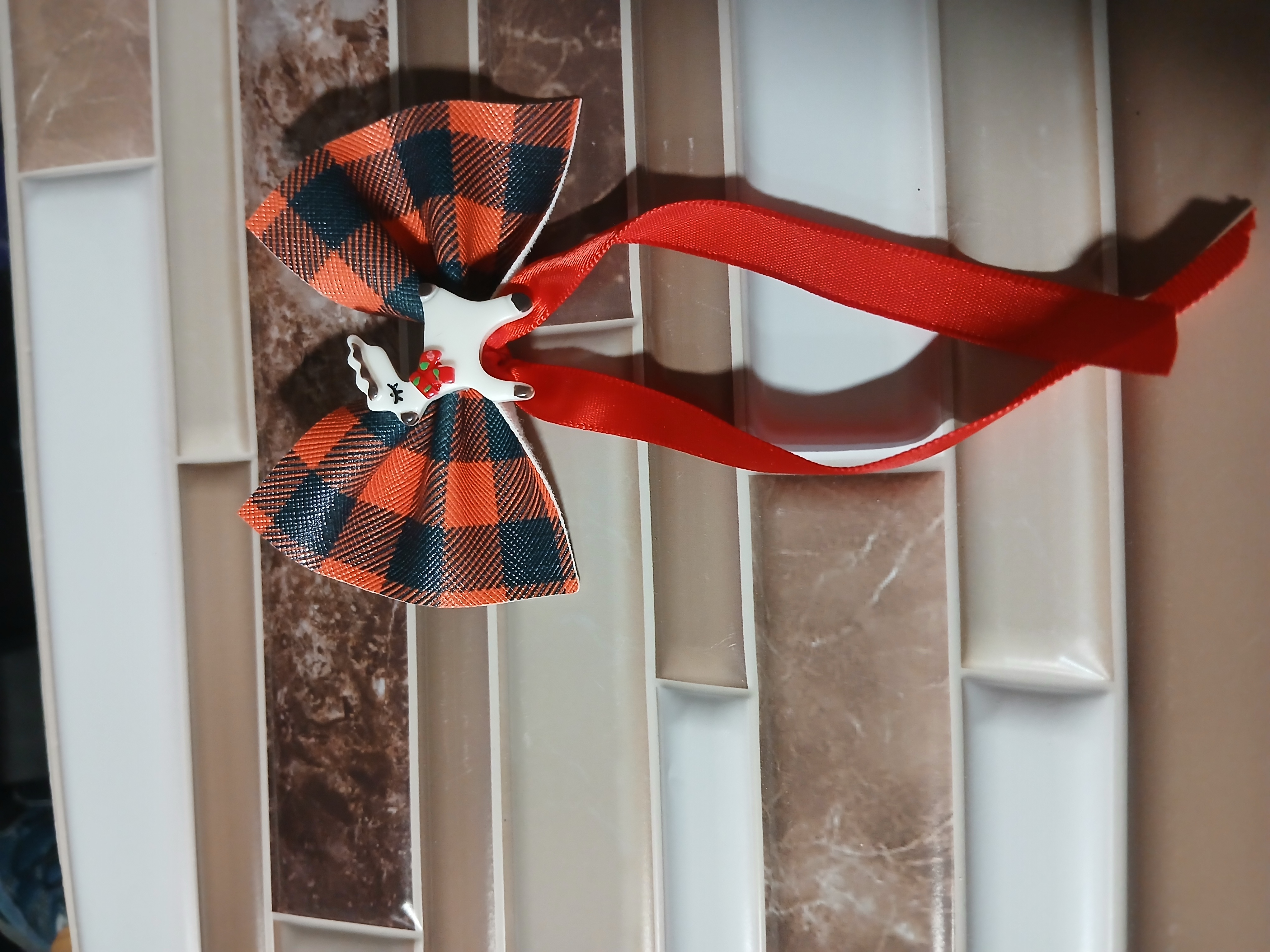 White faux leather with brown reindeer and red and green snowflakes hair bow has a reindeer in the center and has red tulle and green glitter ribbon and on a snap clip