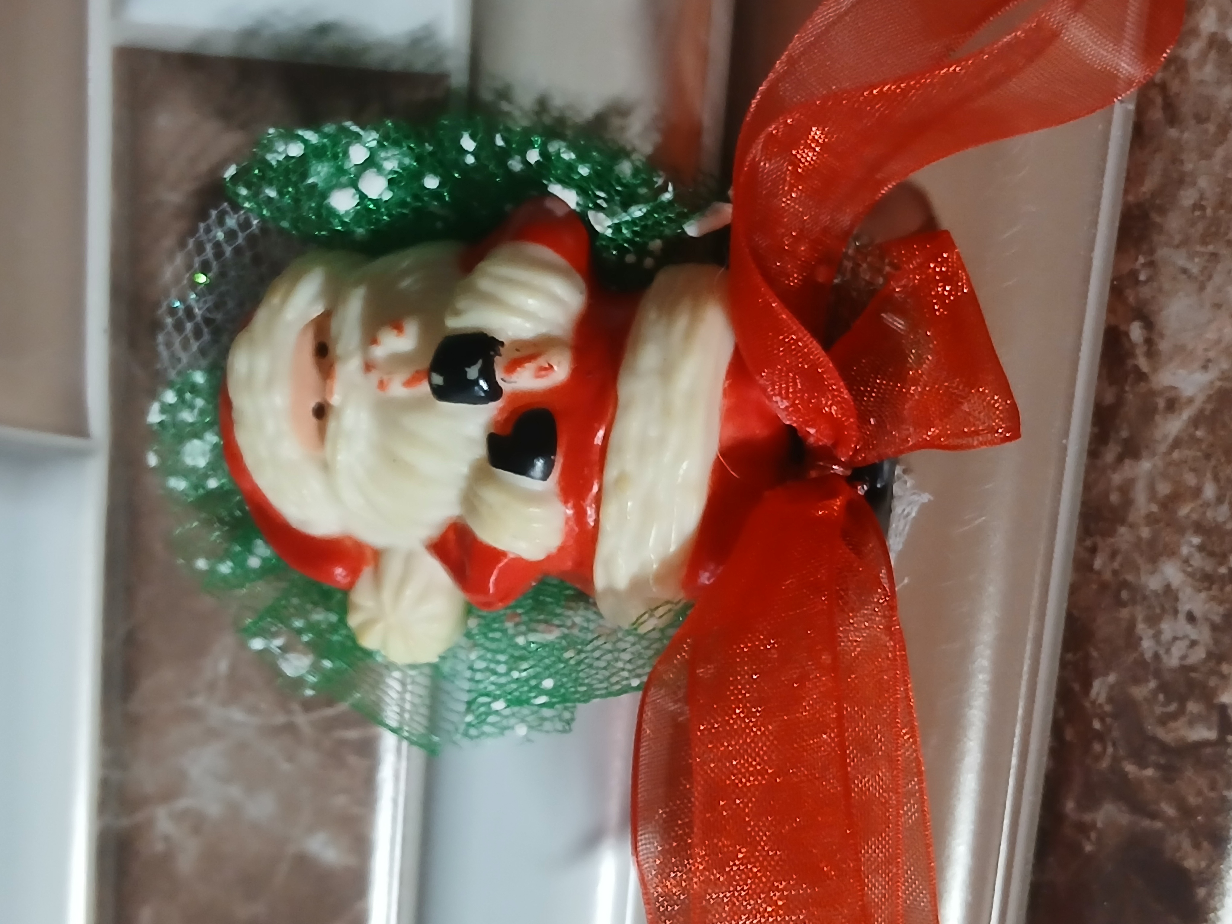 Some call it a pin some a brooch either way this Santa Christmas pin with a facelift of green tulle with white and a red ribbon makes Santa more up to date and hip