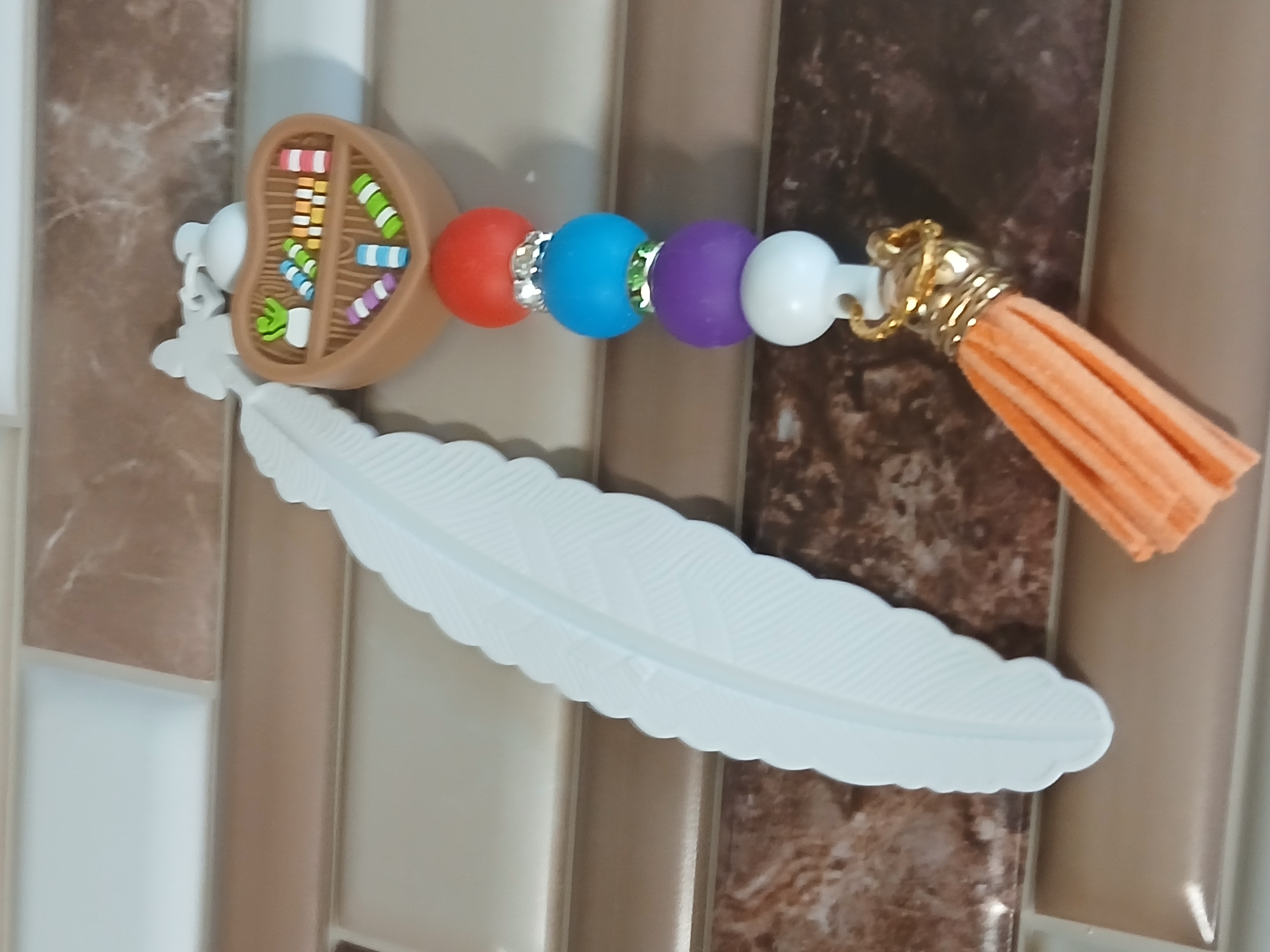 Are you a reader then this bookmark is for you its made of silicone and its white with a small white butterfly on top a heart shaped bookcase silicone focal in brown and a red blue and purple beads with orange tassel
